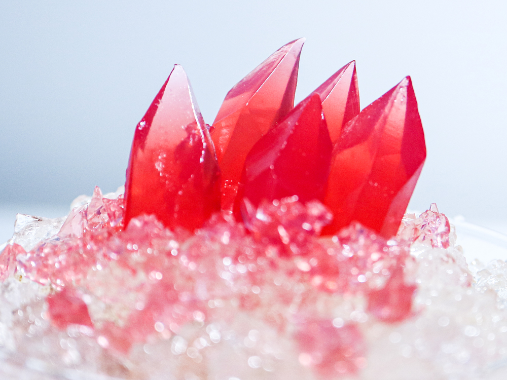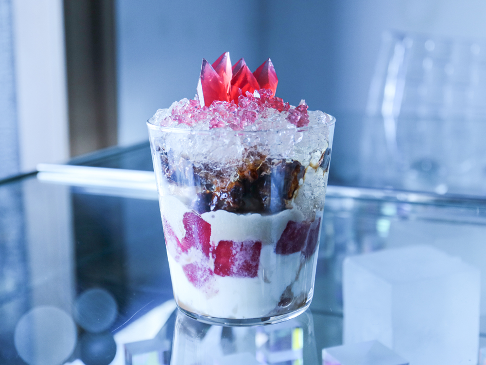 結晶部分は赤いインクルージョンを含む水晶をモチーフに、ほんのり白ワインを効かせたリンゴ味の錦玉羹(きんぎょくかん)で表現しています。
