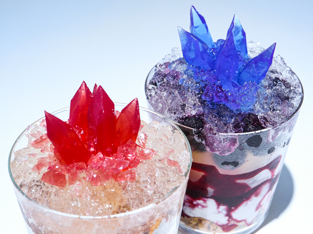 ウサギノネドコ カフェの看板メニューである、「青の水晶パフェ」も同時期に提供いたします。是非、赤と青2つの色のパフェを合わせてお楽しみください。