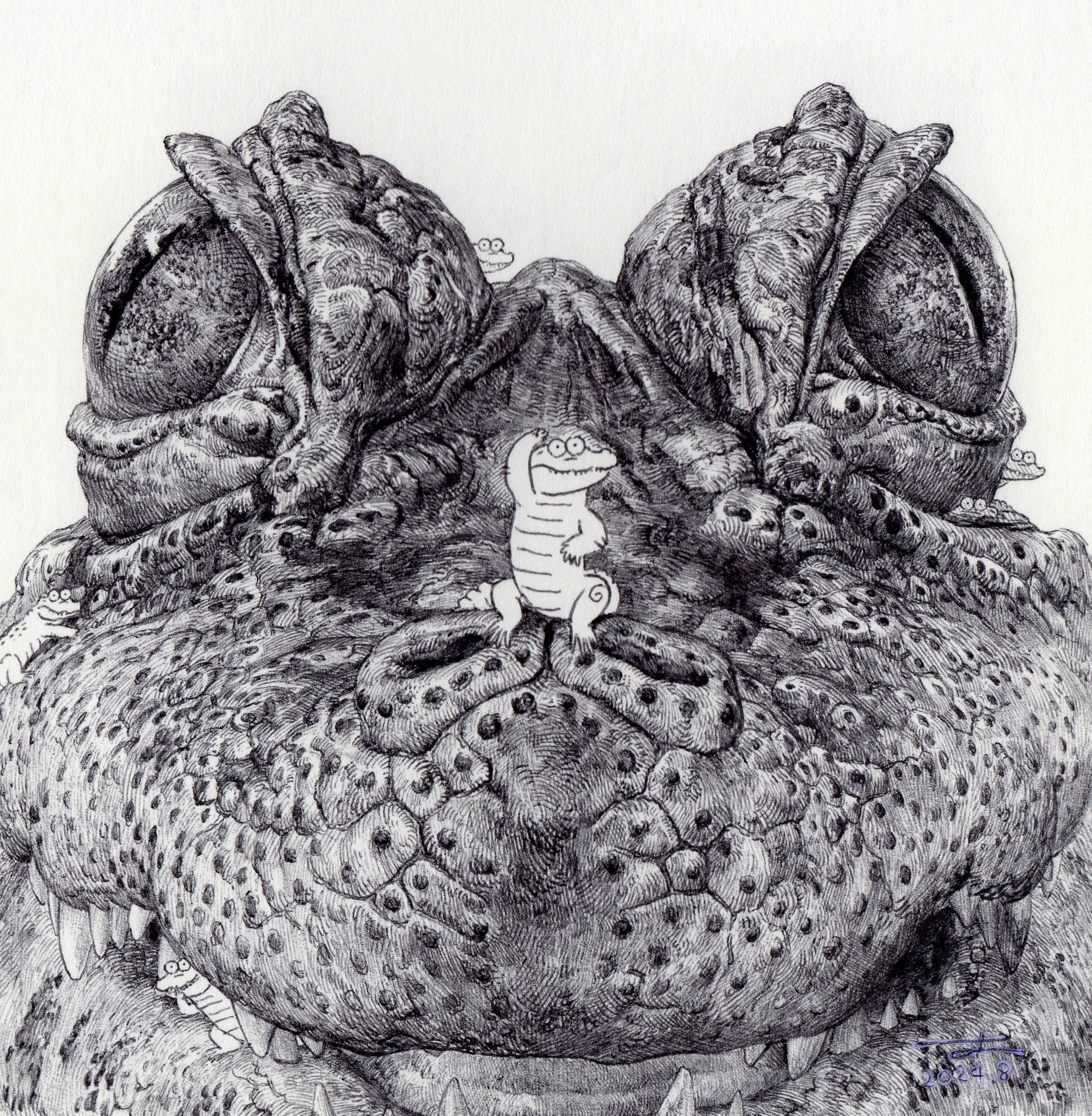 銅版画やボールペン画による緻密な線で、ワニの皮膚の質感や瞳の神秘性を描き出す一方、
