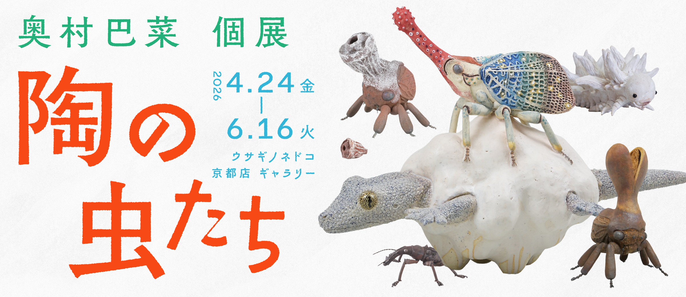 2026年4月24日(金)〜6月16日(火)の期間、ウサギノネドコ京都店ギャラリー(カフェ2階)北側スペースにて奥村巴菜 個展「陶の虫たち」を開催いたします。
