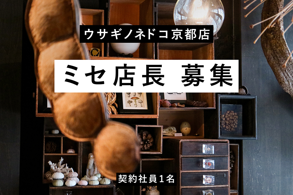 ウサギノネドコ京都店 ミセでは、店舗運営を担う「店長」を募集しております。 ウサギノネドコ京都店 ミセは2012年にオープンし、2026年で15年目を迎えます。15年間で多くの方に知っていただくようになり、関西圏だけでなく全国、そして海外からも足をお運びいただくことが増えました。 引き続き自然の造形美を伝える、世界中にここにしかない店として、高みを目指したいと思っています。そのお店づくりに社員として主体的に関わってくださる方を募集いたします。 経験の有無は問いません。皆様のご応募をお待ちしております。 【求める人材】 【雇用形態と採用予定人数】 ・勤務地: ウサギノネドコ ミセ(京都市中京区西ノ京南原町37) 皆様のご応募をお待ちしております。 【応募ステップ】 (1)募集職種(ミセ 店長候補) ▼ |