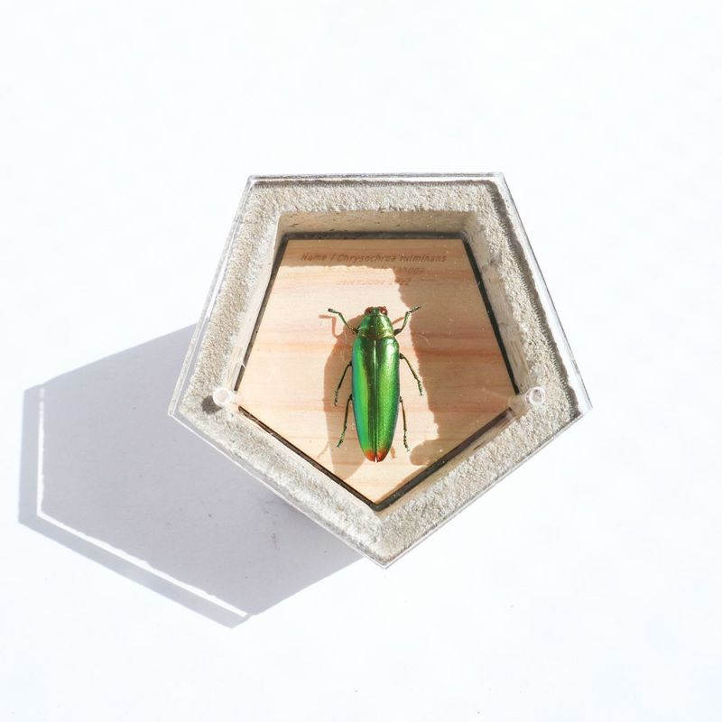 【BUGS-DESIGN】BUG STONE (M) 「昆虫標本をもっと身近に」というコンセプトで作られたインテリア昆虫標本。 昆虫標本から幾何学的な標本ケースまで、ひとつひとつ人の手で丁寧に制作されています。 正面にはめられているアクリルカバーは取り外すことができ、昆虫が持つ形状や色彩・質感をより近くで、さまざまな角度から観察することが可能です。 昆虫を固定している木材には「昆虫名」「採集場所」「採集日」といった記録が明示されており、昆虫標本としての役割もしっかりと果たしています。 実はこちらのBUG STONE、パッケージにもこだわりが。 開封したあと、パッケージの上にBUG STONEを載せることで、簡易的なスタンドとしてご使用いただけます。 標本にはひとつとして同じものはございません。 昆虫のもつ美しさを、ぜひご自宅でお楽しみください。 ■ブランドプロフィール 「BUGS-DESIGN」 デザインを通して「昆虫の魅力」を伝えることを目標に掲げるブランド。 昆虫がもつ色彩や形状、整体環境までデザインに落とし込み、インテリアとして飾れる昆虫グッズを展開しています。 ■素材 セメント、強化アクリル、ヒノキ ■サイズ [Mサイズ] W90mm×H90mm×D70mm/約500g ■ご注意点 ・ご使用前に同封の説明書を必ずお読みください。 ・標本の種類によってケースのサイズ及び価格が異なります。お求めの際はご注意ください。 ・昆虫標本は湿気に弱いため、湿度の高い場所や水回りに置くことは避けてください。 ・紫外線が当たると変色する可能性がございます。直射日光の当たる場所に置くことは避けてください。 ・本品は標本を美しく見せるため、針ではなく高強度のナイロン糸と強力接着剤を使用して固定しています。昆虫標本と接着していた板が外れた際には、BUGS-DESIGNのホームページより直接お問い合わせください。(BUGS-DESIGN ホームページは
