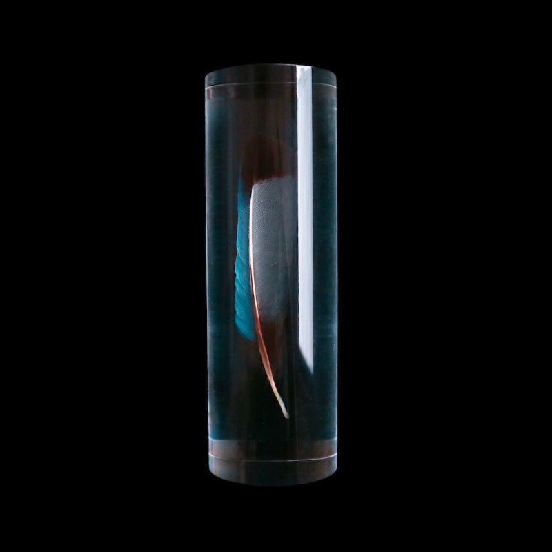 今回は新たに円柱状の樹脂に羽を封入しました。