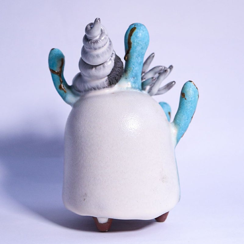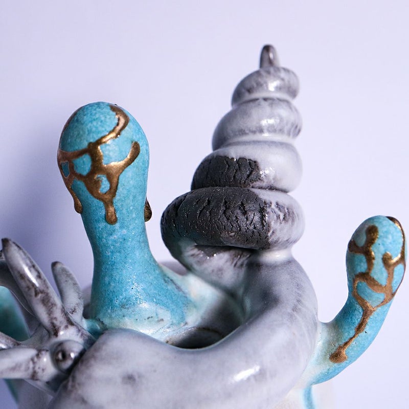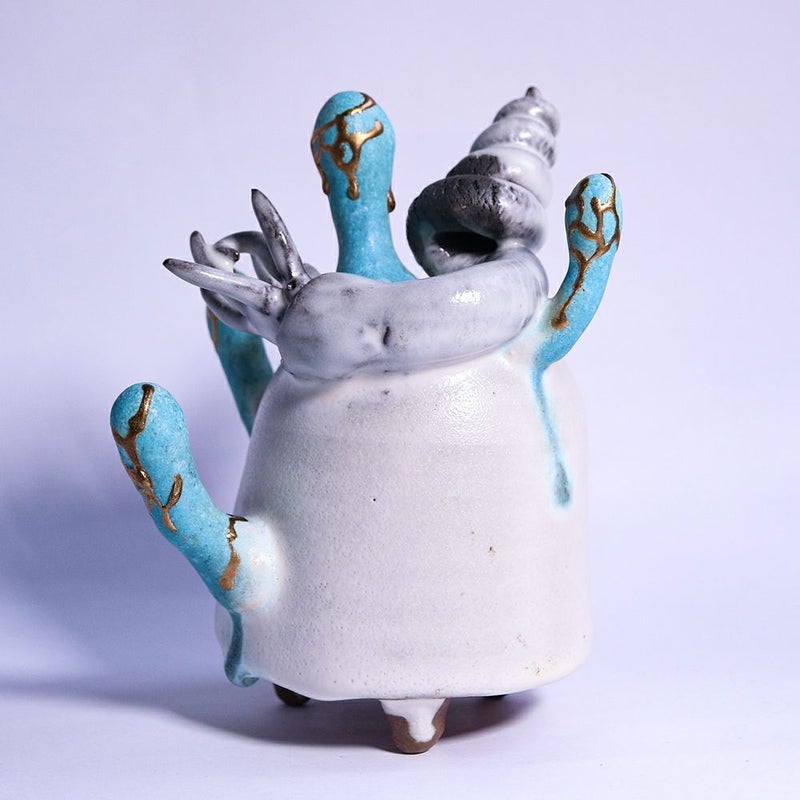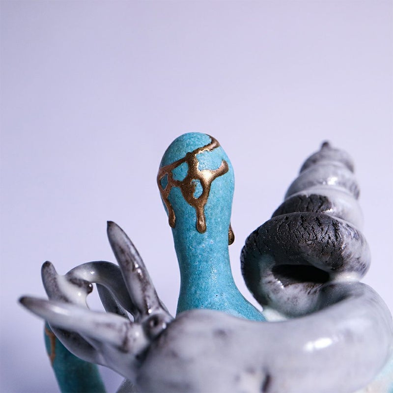 冬虫夏草という生物に魅せられた作者は、その曖昧な生と死を陶器と植物で表現しています。