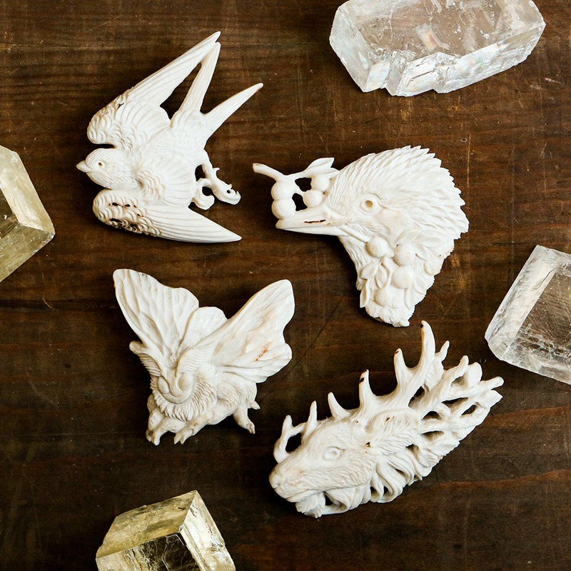 「胚」シリーズ 鹿の角に彫刻を施した、鹿モチーフのアクセサリー。 動物の生命力を感じられるよう、繊細に削り出しています。