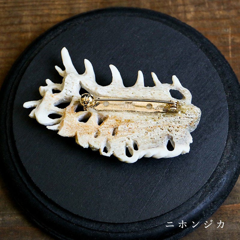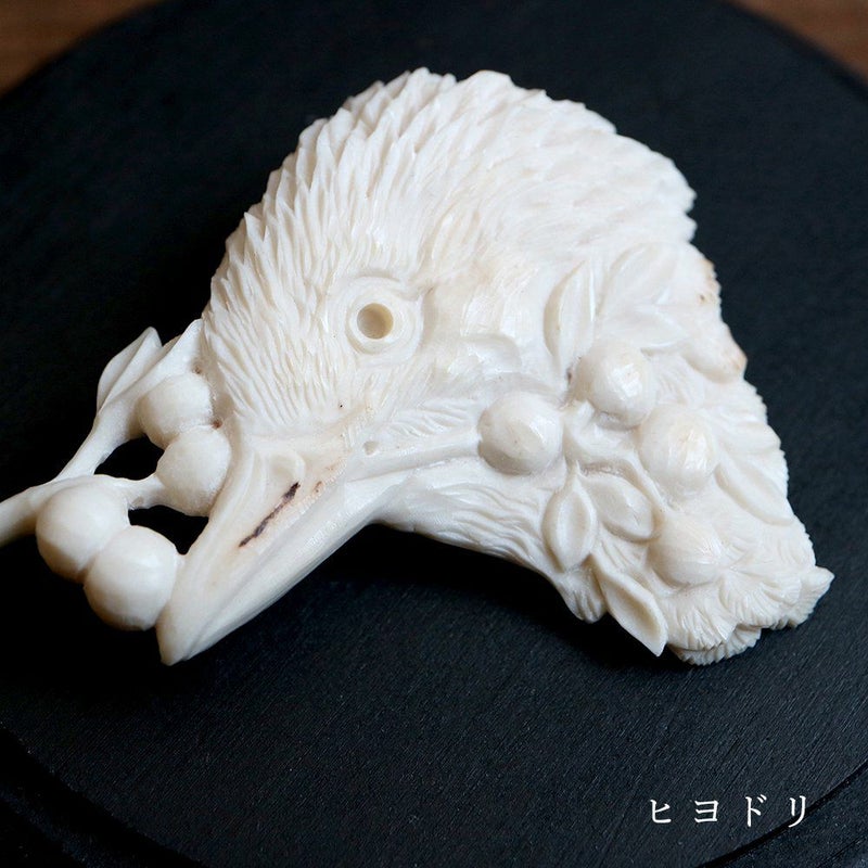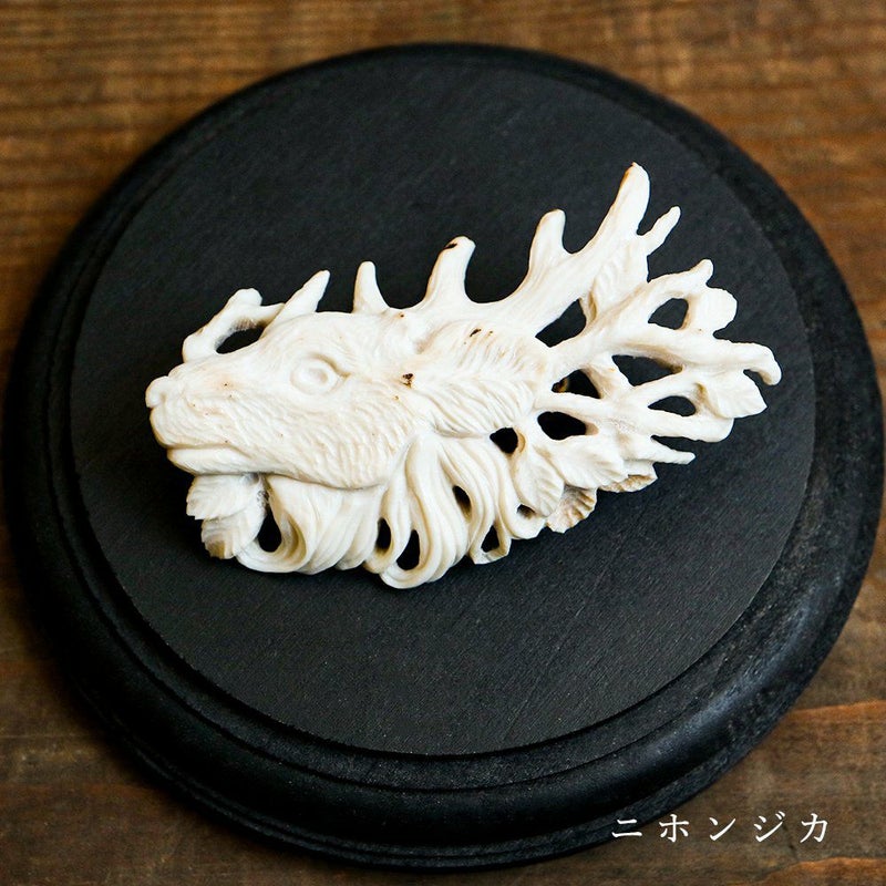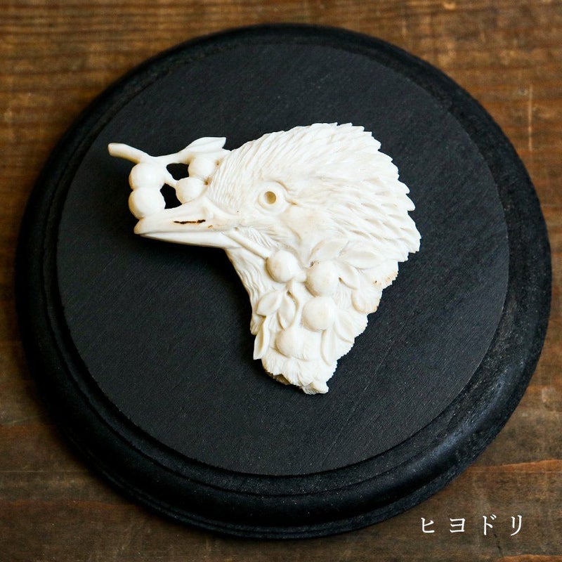 角の表面を削り取った後、滑らかになった内部を削り出しています。 色合いも白〜灰色と個性豊か。丈夫でマットな質感です。 緻密に彫刻されたディティールにご注目ください。 「ヒヨドリ」 ヒヨドリが木の実を獲て、どこか満足げな表情をしています。 毛並みが繊細に削り出されており、体表のなめらかさを想起させます。 「ニホンジカ」 オスのニホンジカの横顔を繊細な透し彫りで表現しています。 木の枝葉と角が交わった優雅なデザインです。 「カイコガ」 絹糸を作り出すカイコガは、その見た目の親しみやすさから人気のある昆虫です。 全身を覆う鱗粉も繊細に彫り込まれています。 「ツバメ」 春を告げる渡り鳥のツバメ。 今にも飛び立ちそうな躍動感あふれる瞬間を表現しています。 _ _ _ _ _ _ _ _ _ _ _ _ _ _ _ _ _ _ _ _ _ _ _ ヒヨドリ ■サイズ D10mm x W60mm x H50mm ■使用部位 鹿角 ■使用金具 真鍮 ■付属品 桐箱 _ _ _ _ _ _ _ _ _ _ _ _ _ _ _ _ _ _ _ _ _ _ _ ニホンジカ ■サイズ D10mm x W70mm x H45mm ■使用部位 鹿角 ■使用金具 真鍮 ■付属品 桐箱 _ _ _ _ _ _ _ _ _ _ _ _ _ _ _ _ _ _ _ _ _ _ _ カイコガ ■サイズ D10mm x W50mm x H48mm ■使用部位 鹿角 ■使用金具 真鍮 ■付属品 桐箱 _ _ _ _ _ _ _ _ _ _ _ _ _ _ _ _ _ _ _ _ _ _ _ ツバメ ■サイズ D10mm x W60mm x H57mm ■使用部位 鹿角 ■使用金具 真鍮 ■付属品 桐箱 _ _ _ _ _ _ _ _ _ _ _ _ _ _ _ _ _ _ _ _ _ _ _ ■ご注意点 ・湿気の多いところに長期間保管するとカビなどの原因になります。 ・ガーゼなどの乾いた布で磨くと、つやが戻ります。 ・布でも取れない汚れなどは、せっけん・歯ブラシで洗い、良く乾かしてください。 ・皮製品のように、お手入れの仕方で経年の風合いの出方が変わります。 ・透かし彫りなど繊細な作りのものは、丁寧にお取り扱いください。