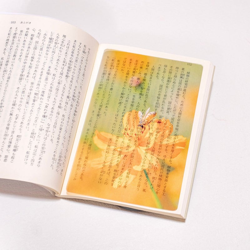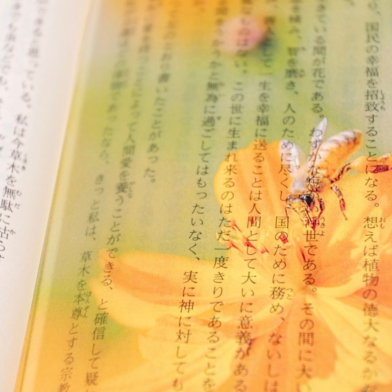 ミツバチの写真が印刷されたこちらの栞は、その暖かな色合いに、思わず春を感じさせる作品です。