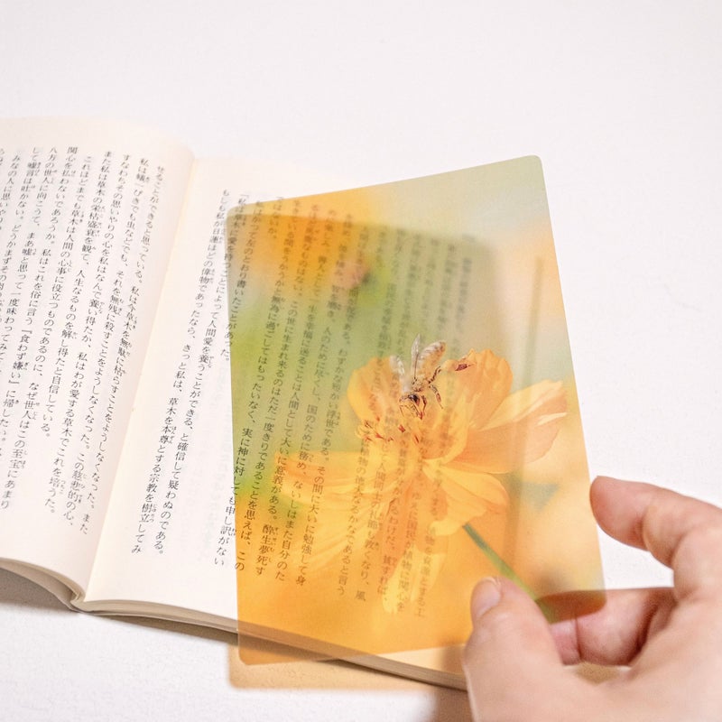 撮影した写真を透明素材に印刷したカード状のしおり。