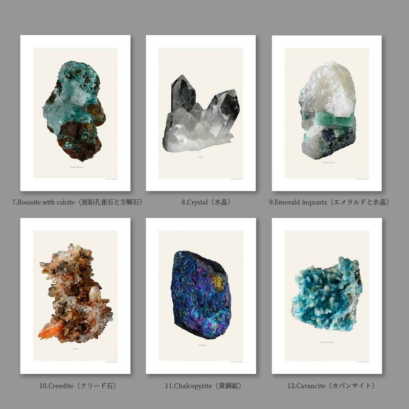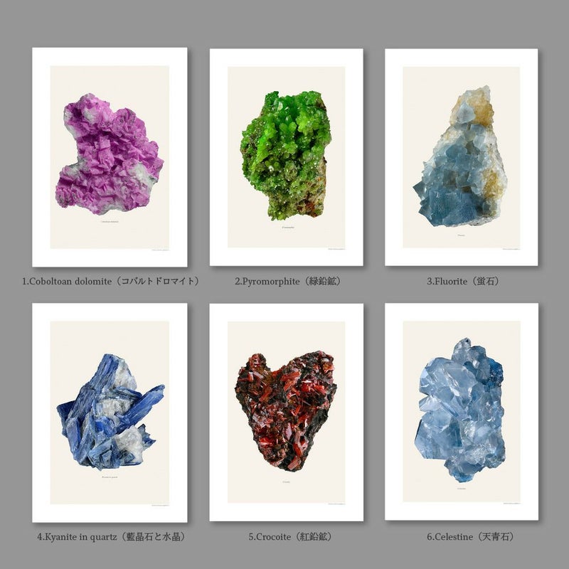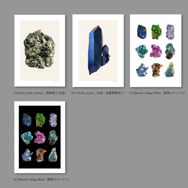 " alt=""> LILJEBERGSは、スウェーデンの写真家 Göran Liljebergsが撮影した昆虫、植物、鉱物の博物写真コレクションです。 このコレクションはすべて深度合成という技術によって作られています。 深度合成とは、同じ被写体の何百枚もの写真を組み合わせ、細部までピントが合った状態にする技術です。 美術品の記録や博物館のデジタルアーカイブに使われるほど、精細な部分を写すことができます。 画像は、ストックホルムのスタジオにあるハイエンドの11色インクジェットプリンターで印刷されています。 厚手のマット紙に長寿命の顔料インクを使用しており、一般的なオフセット印刷をはるかに超える品質と耐久性をもっています。 蝶の毛並みや、葉脈、結晶の粒など余すことなく表現された記録であり、現代の博物画ともいえる写真をお楽しみください。 こちらのページでは鉱物のシリーズを取り扱っています。 単体の写真は標本名が記載されています。 コラージュは白または黒の2パターンの背景からお選びいただけます。 1.Coboltoan dolomite(コバルトドロマイト) 2.Pyromorphite(緑鉛鉱) 3.Fluorite(蛍石) 4.Kyanite in quartz(藍晶石と水晶) 5.Crocoite(紅鉛鉱) 6.Celestine(天青石) 7.Rosasite with calcite(亜鉛孔雀石と方解石) 8.Crystal(水晶) 9.Emerald inquartz(エメラルドと水晶) 10.Creedite(クリード石) 11.Chalcopyrite(黄銅鉱) 12.Cavancite(カバンサイト) 13.Pyrite with crystals(黄鉄鉱と水晶) 14.Cobalt quartz(水晶/金属蒸着加工) 15.Mineral collage,White(鉱物コラージュ) 16.Mineral collage,Black(鉱物コラージュ) ■サイズ A4(210×297mm) ■付属品 保護用の厚紙 ■ご注意点 ・ギフトラッピングは包装紙Bのみ対応しています。