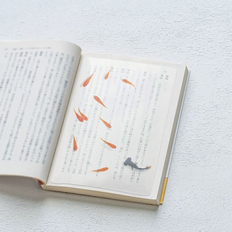 金魚の写真が印刷されたデザインは、さながら金魚が文字の海を泳いでいるかのよう。