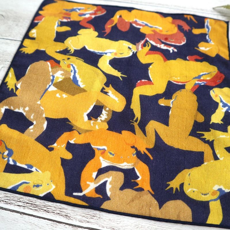 カエルのイラストが全面に描かれた、ガーゼ素材のハンカチです。