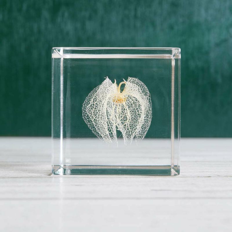 キューブの中でふわりと浮いている姿が、どこか儚さを感じるクロホオズキのSola cube。 しかしよく見てみると、繊細なレースの中に「芯」があることに気がつくはず。