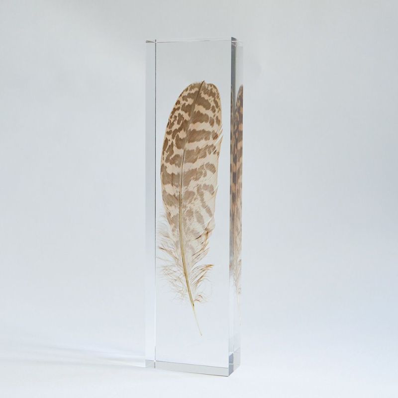 チョウゲンボウは、ハヤブサ目ハヤブサ科に分類される鳥の一種。 ユーラシア大陸とアフリカ大陸に広く分布しており、寒冷地で繁殖した個体は冬季に南方へ渡り越冬します。 羽は赤褐色に黒斑があり、雄の頭と尾は青灰色、雌は褐色で翼の先が尖っているのが特徴です。 ■素材 アクリル樹脂、チョウゲンボウの羽 ■サイズ 約D35mm ×W70mm × H260mm ■重さ 約760g ■ご注意点 ・本商品は1つ1つ職人が手作りしています。 ・製造の工程上、内部に微細な気泡やチリ状のものが発生することがありますが、商品の不良ではありません。 ・温度の高い場所に長時間置くと、変形したり細かいクラック(ひび割れ)が入ることがあります。炎天下などの高温を避けてご使用ください。 ・シンナーやアルコールなどの溶液や薬品に触れると細かいクラック(ひび割れ)が入ることがあります。お手入れの際は柔らかい布で拭いてください。 ・ギフトラッピングには対応しておりません。