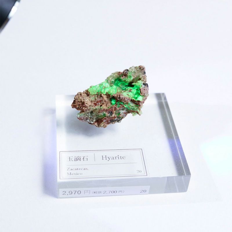 一見地味にも見える石ですが、UVライトを当てると黄緑色に蛍光します。(写真は365nmを使用)