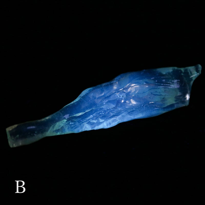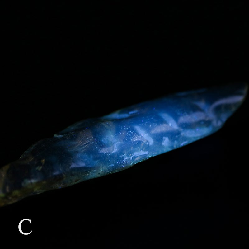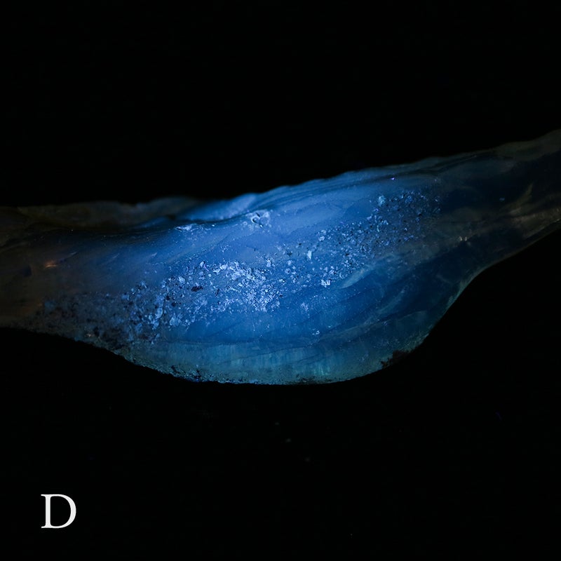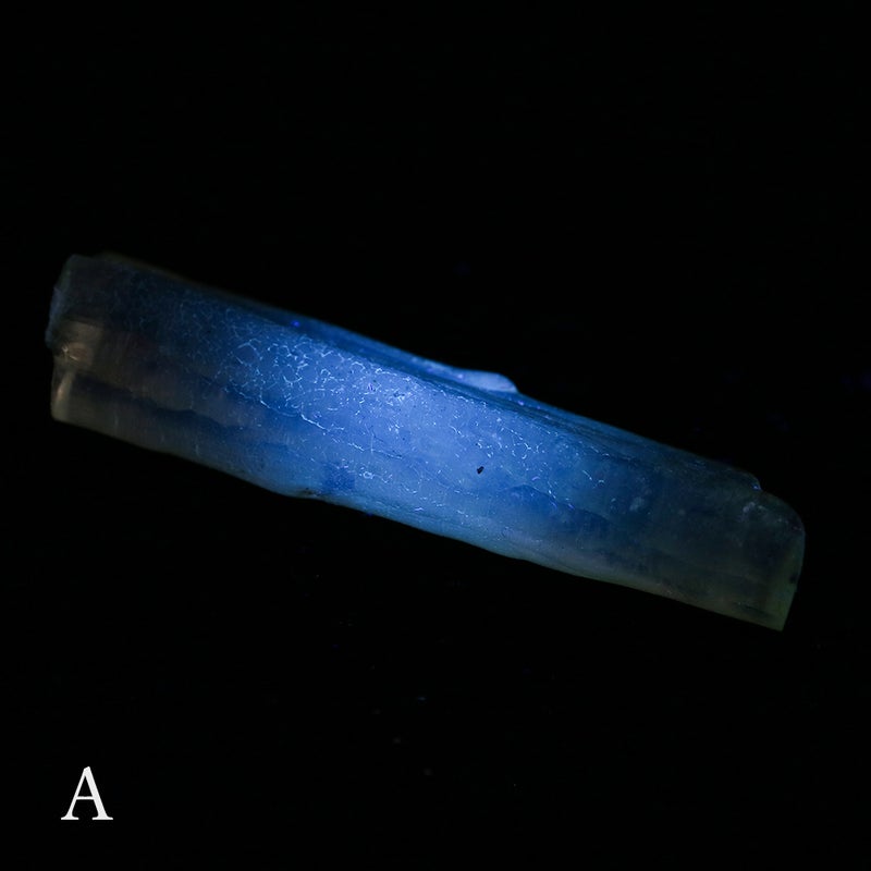 この鉱物の見どころは、UVライトを当てると青白く蛍光するところ。