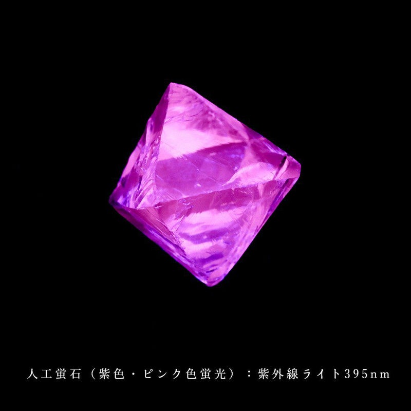 人工蛍石は、高級カメラや天体望遠鏡などの高性能レンズに使われます。 米国スミソニアン天文台での信号観測に活用されるなど、銀河の謎解明へ貢献しています。 日本で研究製造されており、日本の技術の結晶ともいえます。 本来レンズに使われるものは無色透明ですが、こちらは微量の色素材を混ぜています。 そのため照射する光の波長によって異なる表情を見せてくれます。 紫外線ライトや日光に当てて、色の変化をお楽しみください。 ・紫色とピンク色蛍光 明るい日光では黄色がかった透明ですが、 波長が365nmの紫外線ライトでは紫色に、395nmではピンク色に蛍光します。 光の波長によって3つの表情を楽しめる人工蛍石です。 人工蛍石ができるまでを詳しく説明したページは