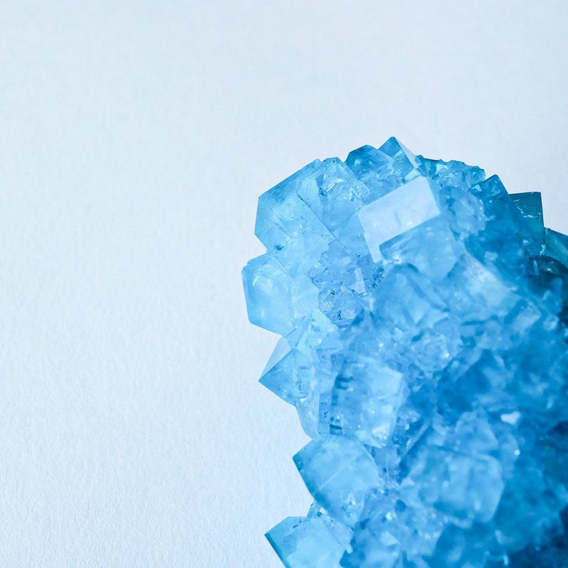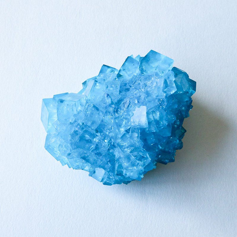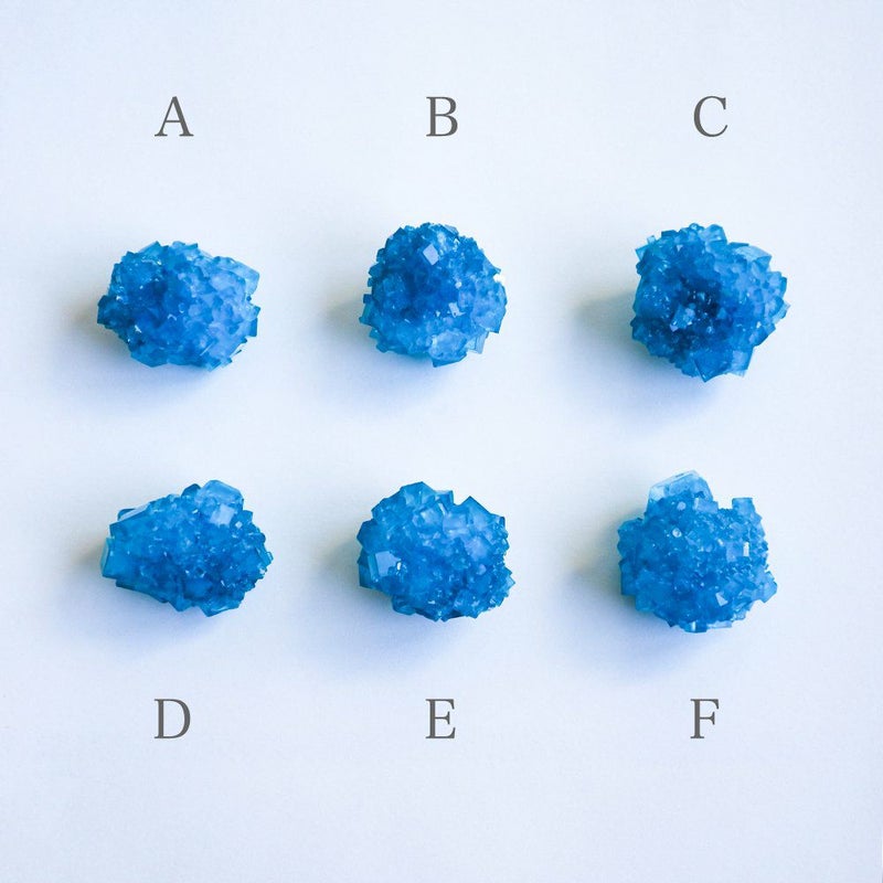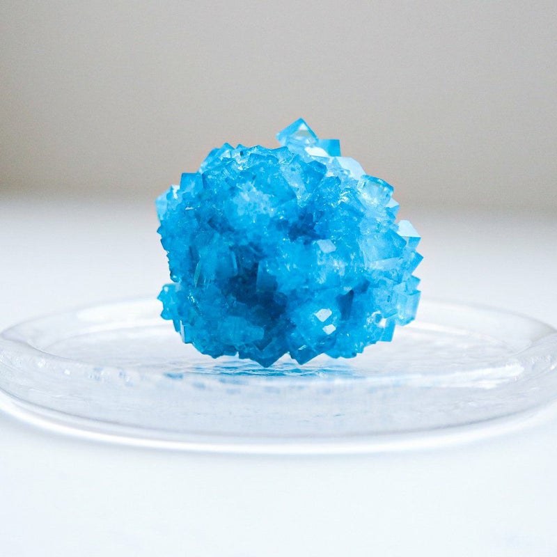 人工結晶は、人間による工夫と自然の力の共同作業によって生まれる、自然と人工の狭間にあるもっとも象徴的な物の一つと言えるかもしれません。 条件を整え、きっかけを与えるところまでは人間の手で行いますが、実際に結晶ができていく過程を自然の力に委ねることで、はじめてその造形美が完成します。 透明度の高い結晶は、安定した環境下で時間をかけることで完成します。 人間の手と自然の摂理が交わって出来た空色の結晶です。 ■製造国 Japan ■サイズ 直径 約50~40mm ■ご注意点 ・大きさに個体差があります。採寸は平均値になります。 ・環境によっては、色が染み出して結晶と接する面に付着する可能性があります。 ・高温多湿の場所を避け、色が染み込みにくい素材の上に置いて(布や木の上を避けて)ご鑑賞いただくことを推奨いたします。 ・水に溶けやすいため、濡れた手などで触らず、湿気の多いところを避けてご鑑賞ください。 ・指紋がつきやすいため、結晶の角部分を持つようにしてください。 (稀に鋭い部分がありますので、十分にご注意ください)