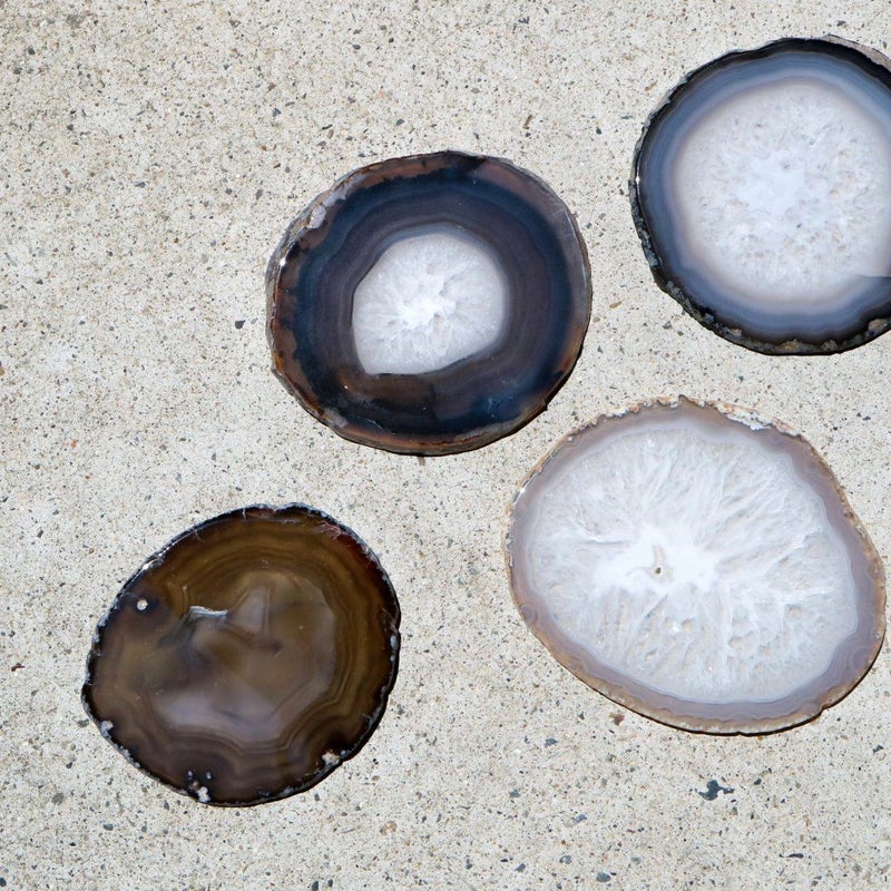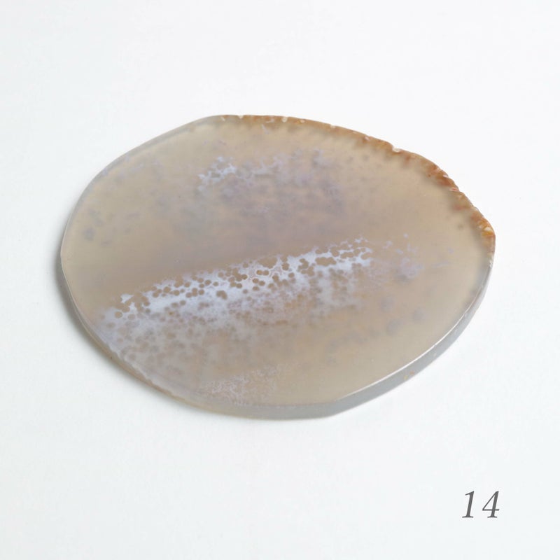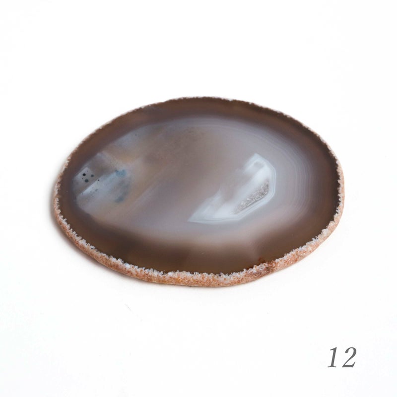 縞模様が特徴的なアゲート(メノウ)の原石をスライス加工して作ったコースター。 模様の入り方や色彩が千差万別のアゲート。 その個性に魅了されるコレクターも多い鉱物です。 こちらのコースターも、もちろん千差万別。 色彩や形など個性豊かなアゲートが集まりました。