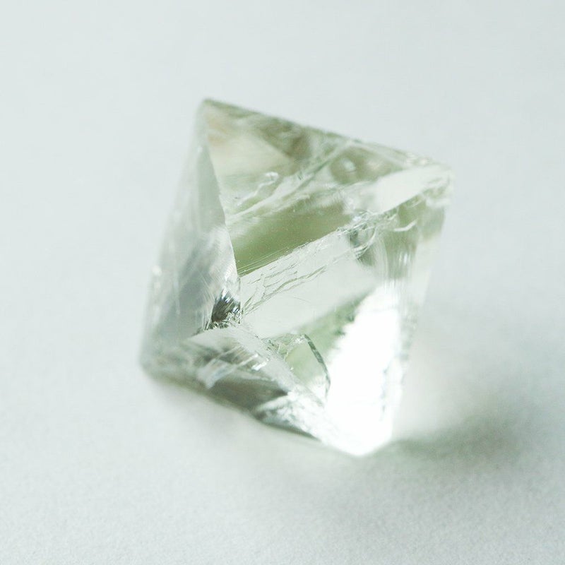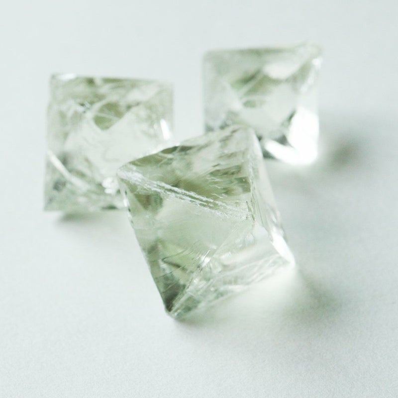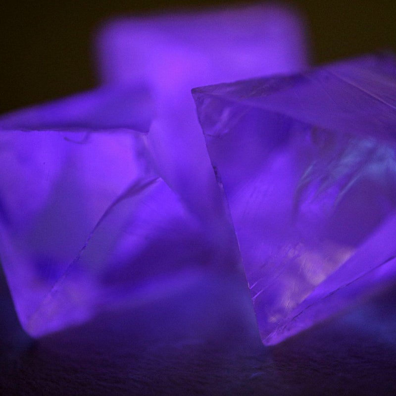 人工蛍石は、高級カメラや天体望遠鏡などの高性能レンズに使われます。 米国スミソニアン天文台での信号観測に活用されるなど、銀河の謎解明へ貢献しています。 日本で研究製造されており、日本の技術の結晶ともいえます。 本来レンズに使われるものは無色透明ですが、こちらは微量の色素材を混ぜています。 そのため照射する光の波長によって異なる表情を見せてくれます。 紫外線ライトや日光に当てて、色の変化をお楽しみください。 ・薄紫色蛍光 明るい日光では緑色がかった透明で、紫外線ライトでは薄紫色に蛍光します。 人工蛍石(紫色蛍光)と比べて、蛍光時の透明感が美しいです。 人工蛍石ができるまでを詳しく説明したページは