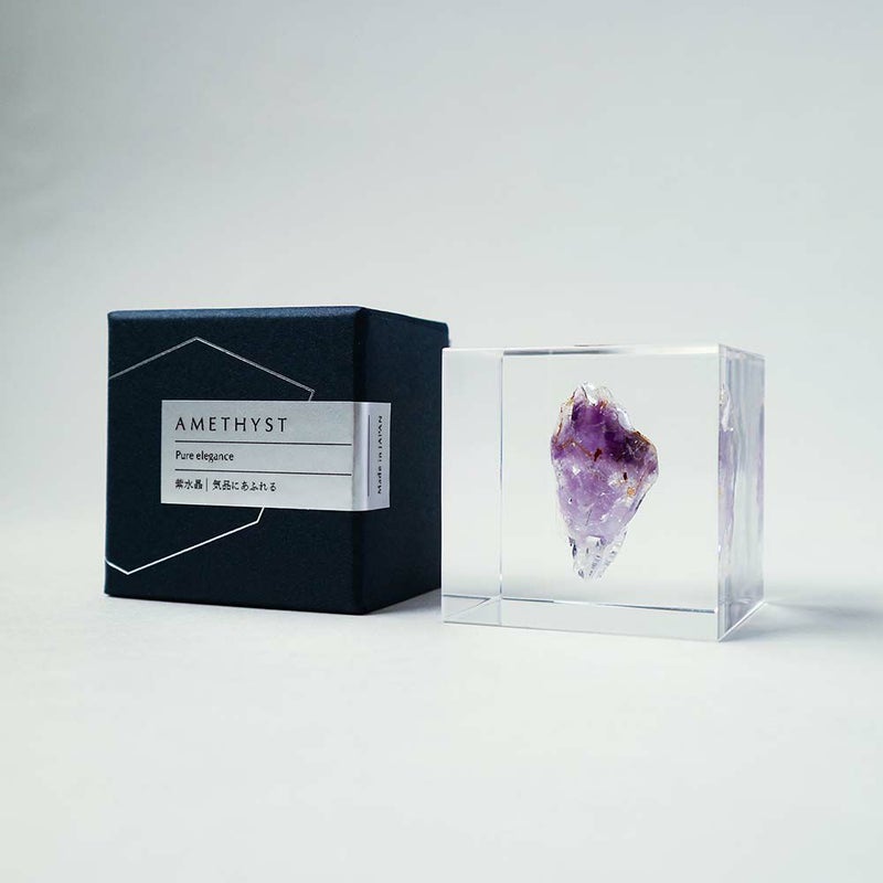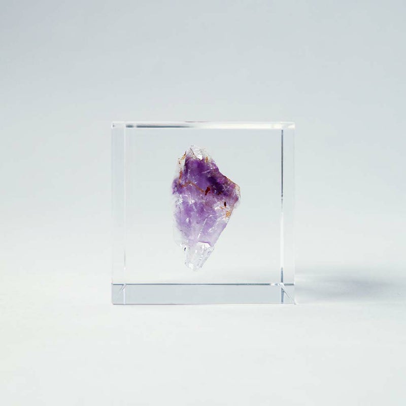 宙言葉:気品にあふれる 2月の誕生石としても有名な紫水晶。 美しい紫色は、結晶にわずかに含まれる鉄イオンによって現れます。 古くよりこの色に人々は魅了され、高貴な石として珍重されてきました。 王室や司教の装飾品として用いられてきた歴史の深い鉱物です。 ■素材 アクリル樹脂、鉱物 ■サイズ D40mm × W40mm × H40mm ■重さ 約80グラム ■ご注意点 ・Sola cube は1つ1つ職人が手作りしています。封入されている植物の大きさ、色、形はすべて異なります。 ・製造の工程上、内部に微細な気泡やチリ状のものが発生することがありますが、商品の不良ではありません。 ・温度の高い場所に長時間置くと、変形したり細かいクラック(ひび割れ)が入ることがあります。炎天下などの高温を避けてご使用ください。 ・シンナーやアルコールなどの溶液や薬品に触れると細かいクラック(ひび割れ)が入ることがあります。お手入れの際は柔らかい布で拭いてください。