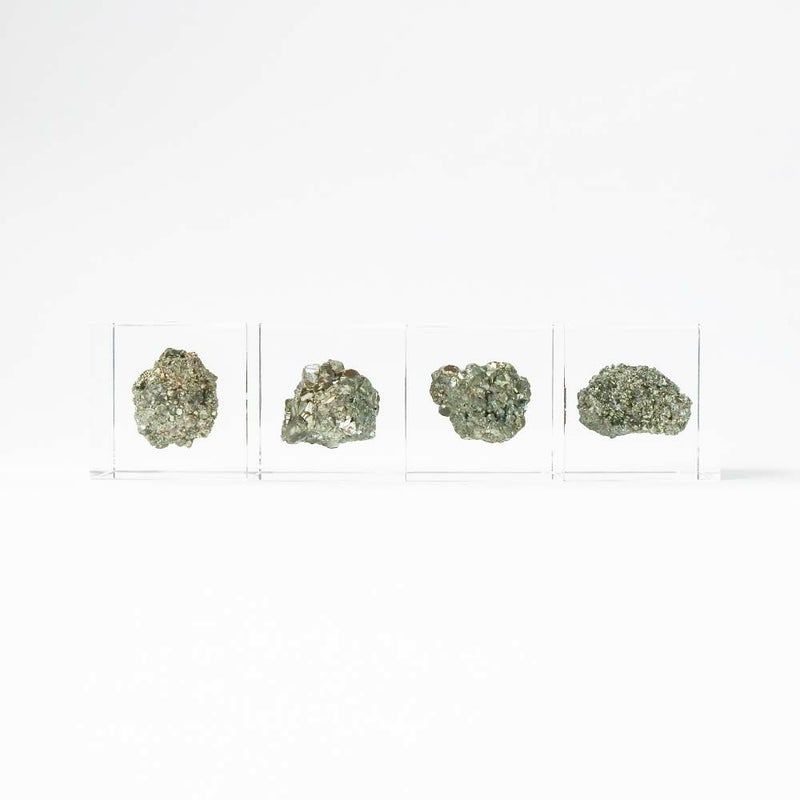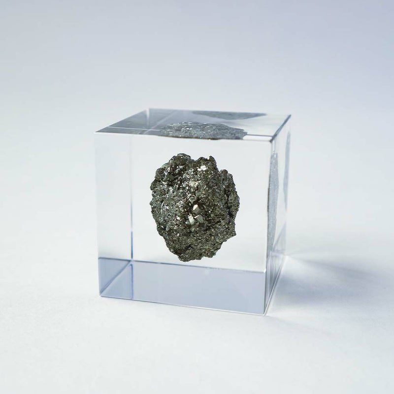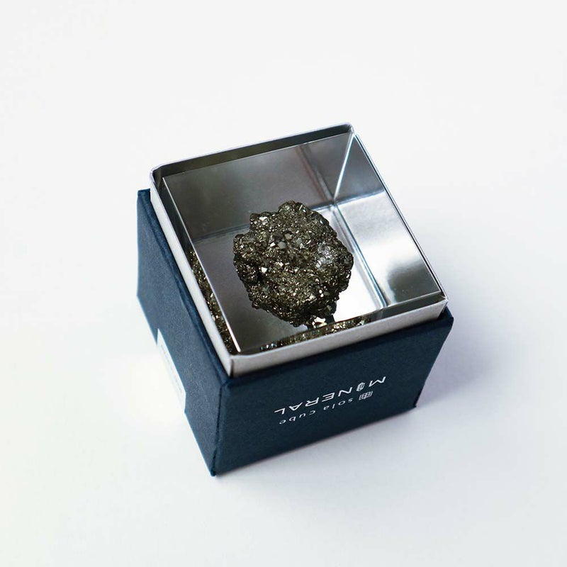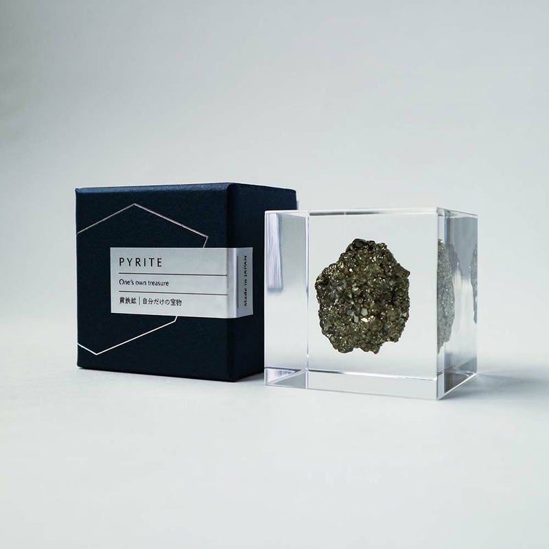 宙言葉:自分だけの宝物 立方体や多面体、球体など様々な形状に結晶する鉱物です。 サイコロのような形で産出する物もあり、人が削り出したかと思うほどです。 鈍い金色の輝きをもつため、かつて発見した人は本物の金と間違えたというエピソードもあります。 ■素材 アクリル樹脂、鉱物 ■サイズ D40mm × W40mm × H40mm ■重さ 約80グラム ■ご注意点 ・Sola cube は1つ1つ職人が手作りしています。封入されている植物の大きさ、色、形はすべて異なります。 ・製造の工程上、内部に微細な気泡やチリ状のものが発生することがありますが、商品の不良ではありません。 ・温度の高い場所に長時間置くと、変形したり細かいクラック(ひび割れ)が入ることがあります。炎天下などの高温を避けてご使用ください。 ・シンナーやアルコールなどの溶液や薬品に触れると細かいクラック(ひび割れ)が入ることがあります。お手入れの際は柔らかい布で拭いてください。