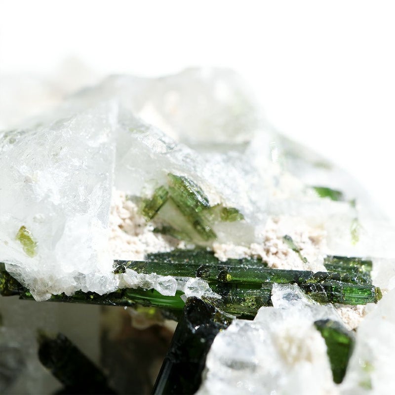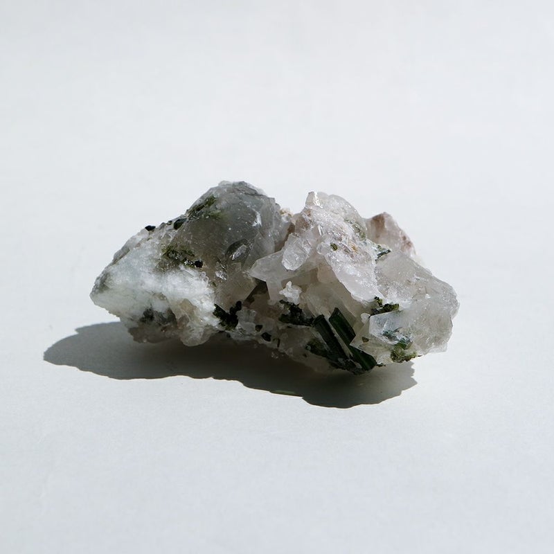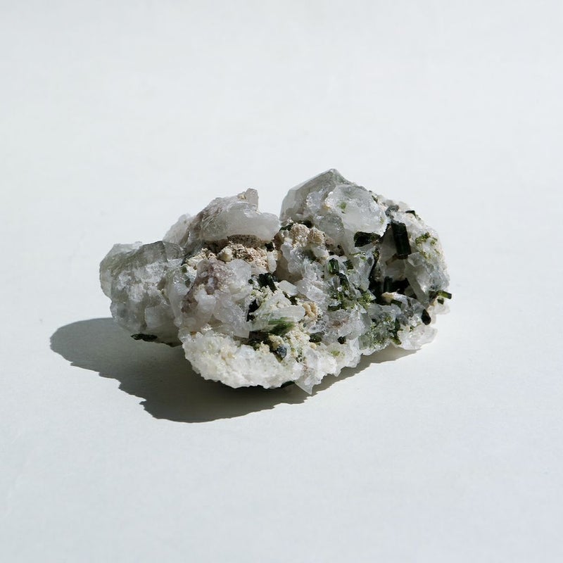 トルマリン 「すべての色を持つ」と言われるほど 豊富な色で産出するトルマリン。 和名で「電気石」と言い、熱を加えると帯電する特徴があります。 こちらは小さなグリーンの結晶がまるで植物のような個体。 全体的に結晶がついていますので、お手元で様々な角度からご鑑賞ください。 ■産地 Minas gerais, Brasil / ブラジル ミナスジェライス ■サイズ W40mm × D35mm × H30mm / 85g ■ご注意点 ・鑑別書は付属しません。