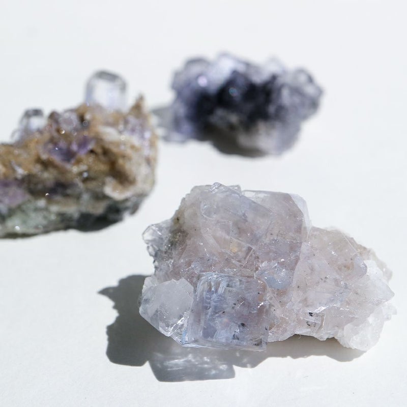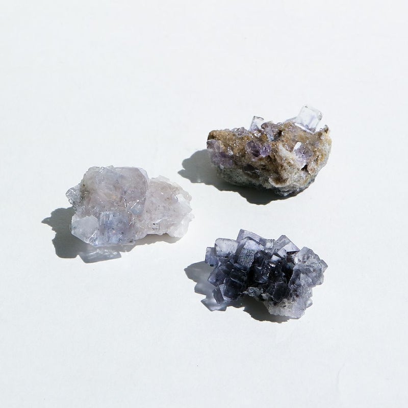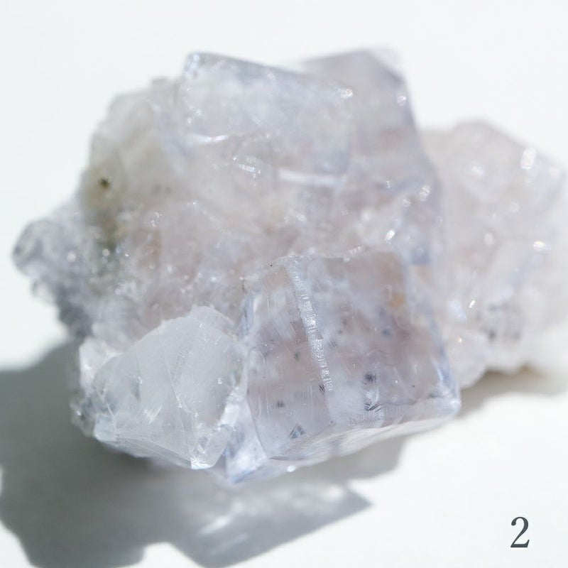 蛍石 スペイン アストゥリアス州産の蛍石。 さまざまな色が存在する蛍石ですが、こちらの個体は無色透明です。 透明度が非常に高く、その内部まで肉眼でご覧いただけます。 また、この地域の蛍石は立方体で結晶するという特徴があります。 小ぶりながらも蛍石の魅力がギュッと詰まった3種類のご用意です。 お手元でその美しさをご堪能ください。 ■産地 Asturias, Spain/スペイン アストゥリアス州 ■サイズ [ 2 ] W35mm × D20mm × H20mm / 35g ■ご注意点 ・鑑別書は付属しません。