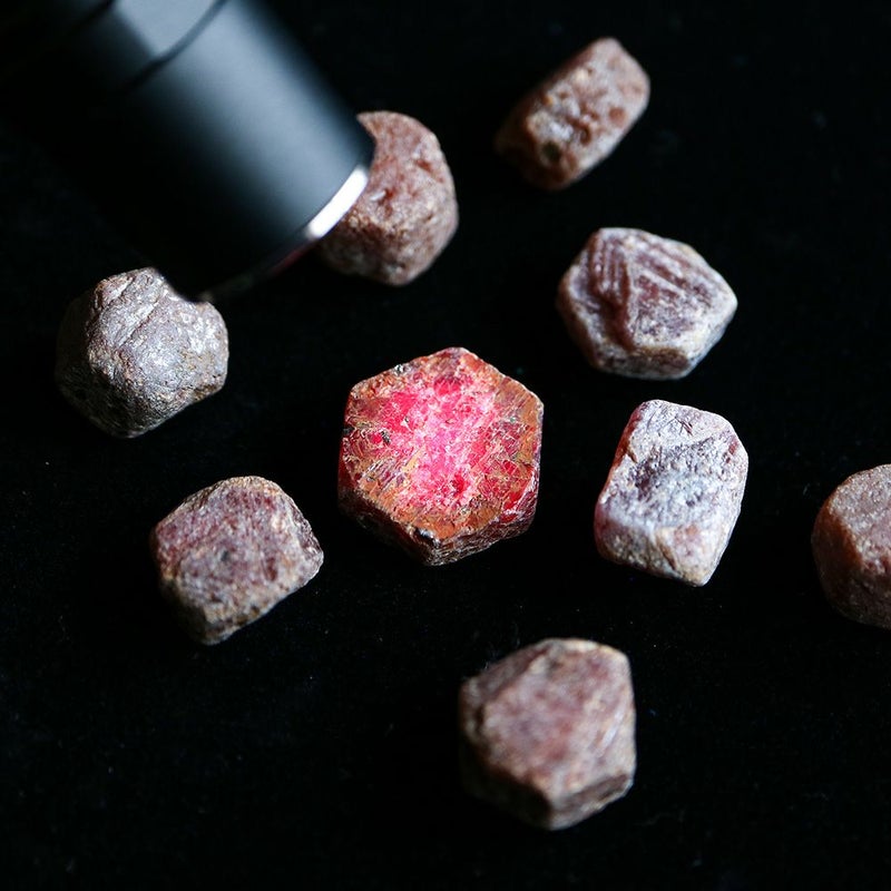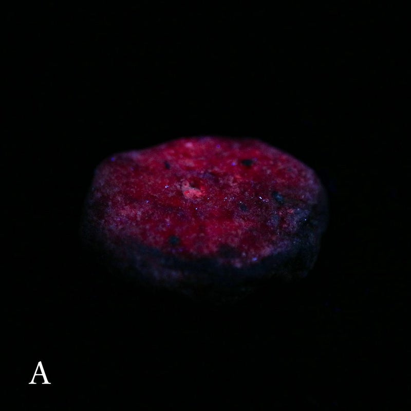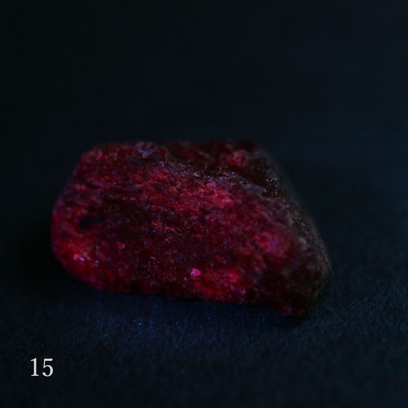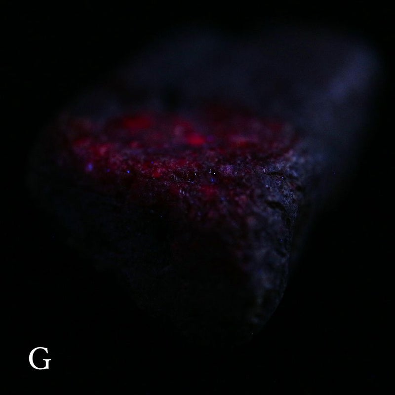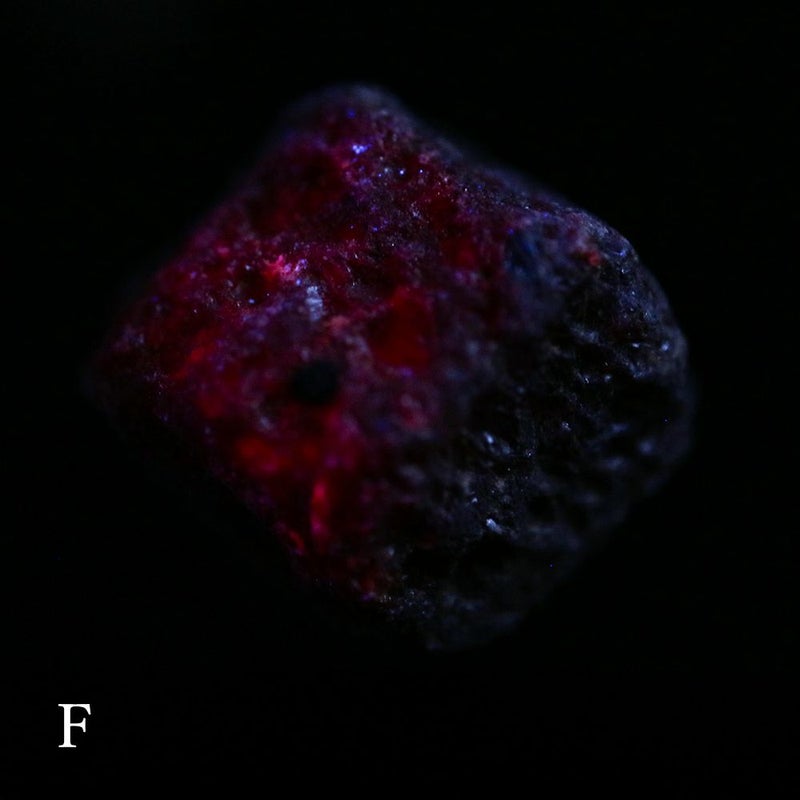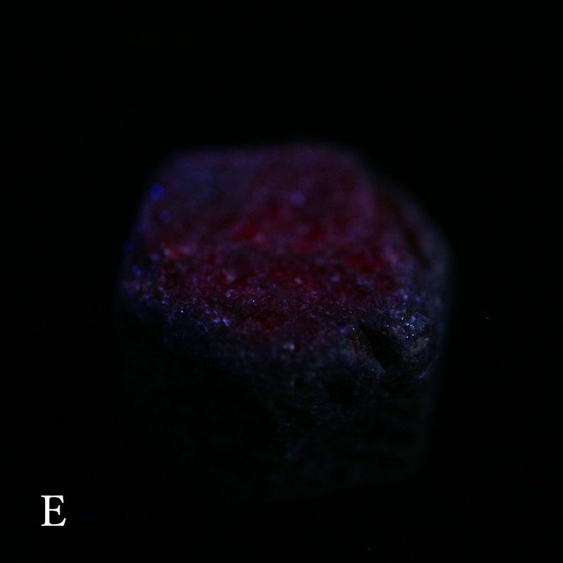 こちらのルビーは365nmの紫外線に当てると、鮮やかな赤色に蛍光します。
