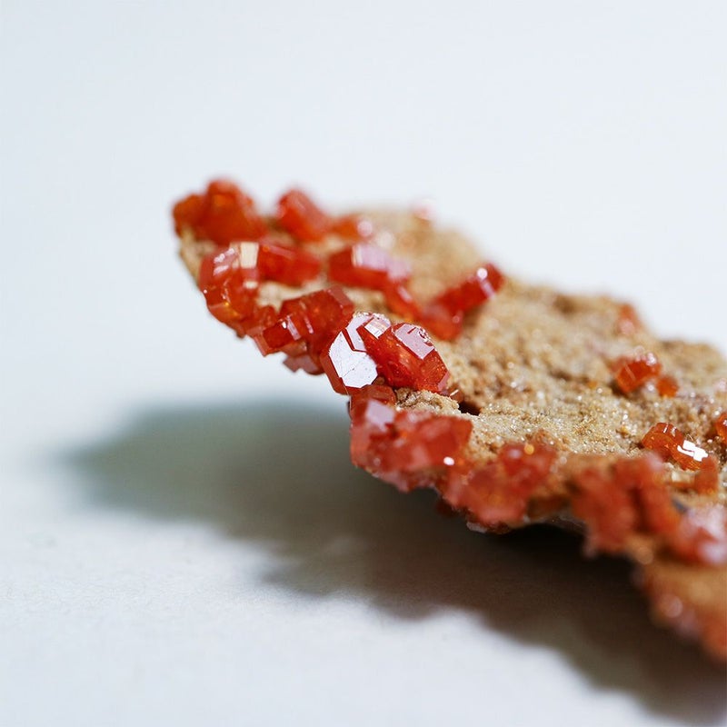 目にも鮮やかな朱色が美しいバナジン鉛鉱。