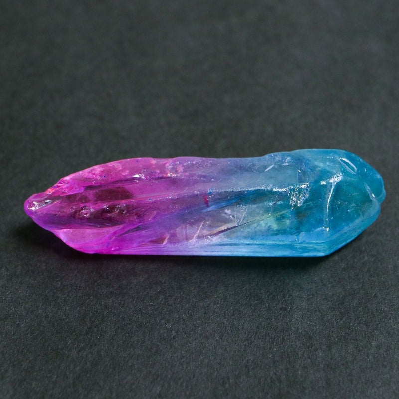 こちらは透明度の高い水晶の表面に、真空状態の中で金属を蒸着させた加工石です。