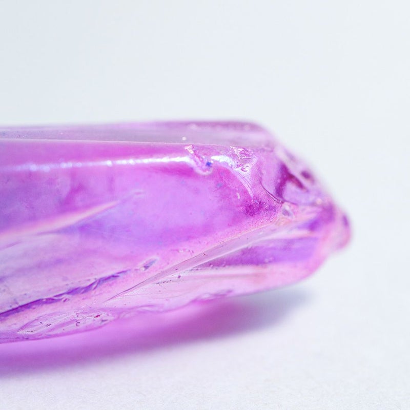 水晶の透明感や自然物特有の形状はそのままに、光に照らされた時の金属光沢や虹色の輝きから不思議な魅力と美しさを感じます。