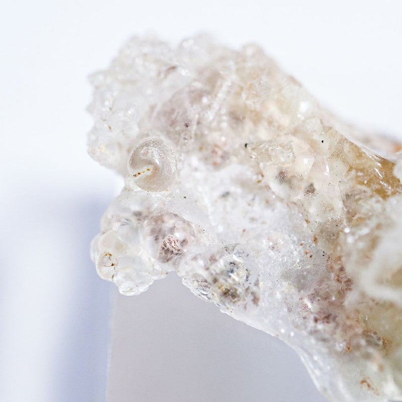 和名を玉滴石と言い、「玉が滴(したた)る」と書くこの石は、地下水に溶けている二酸化ケイ素が常温で水滴のように固まってできたもの。