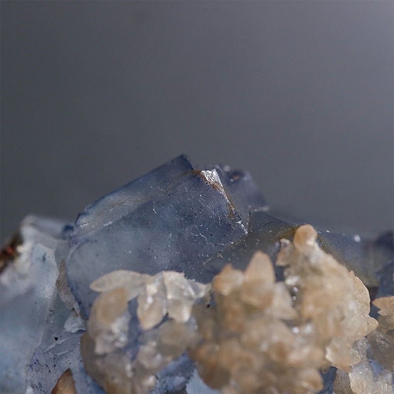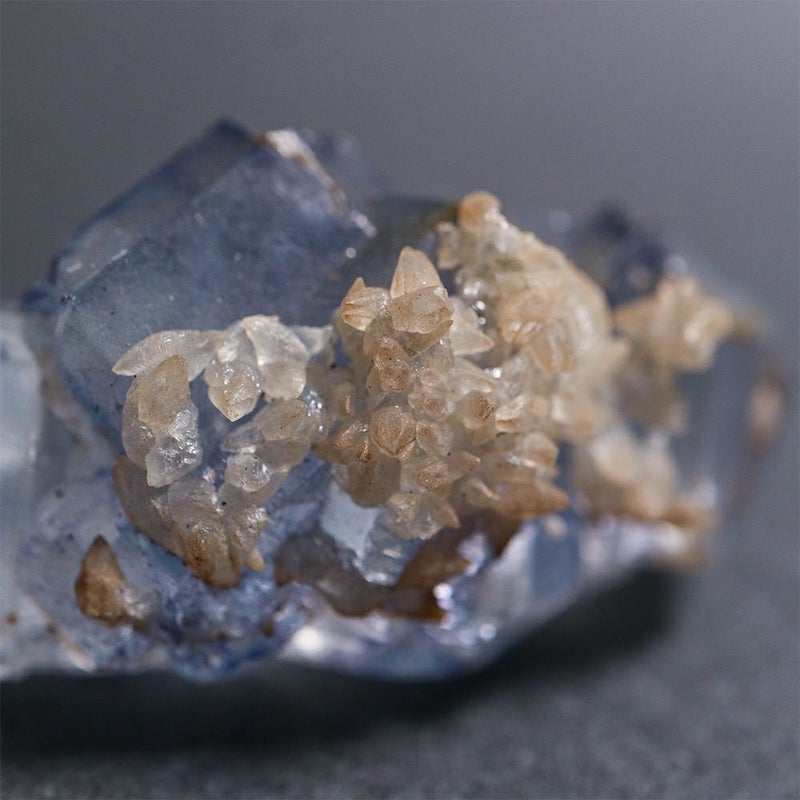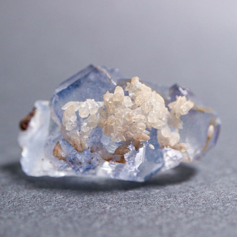 淡いグレーがかった青色の蛍石の上に、細かなカルサイトがキラキラと輝いています。 連なった結晶の形も非常に面白いです。