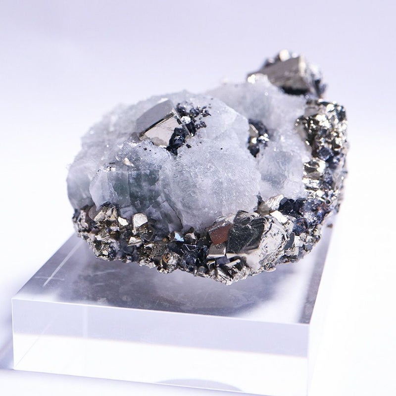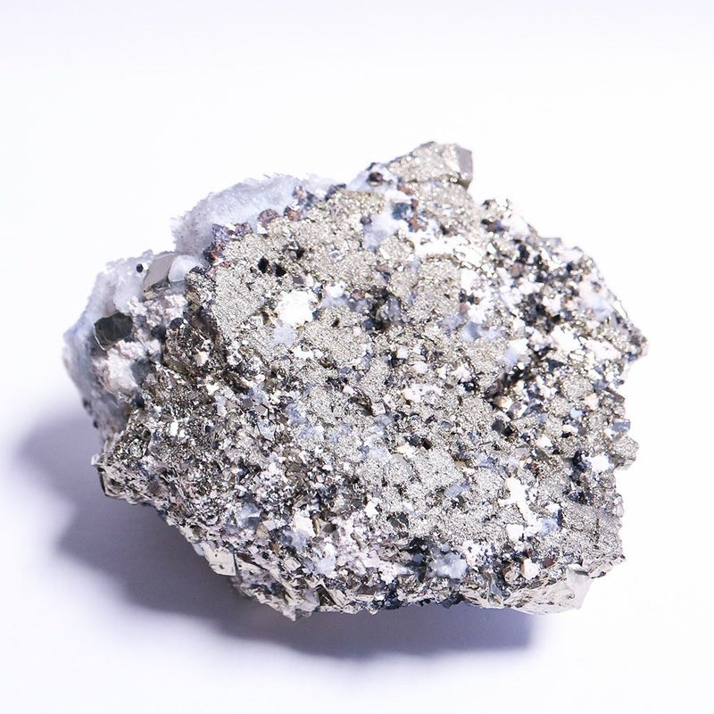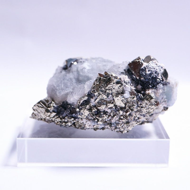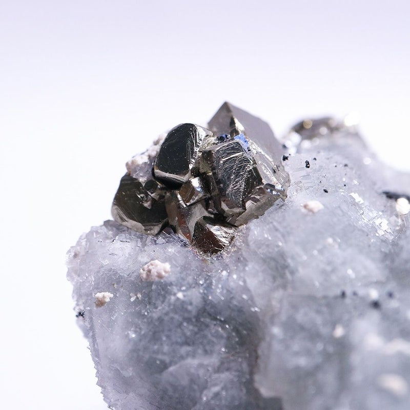 パイライト(黄鉄鉱)が共生しており、黄金の結晶が顔を覗かせます。