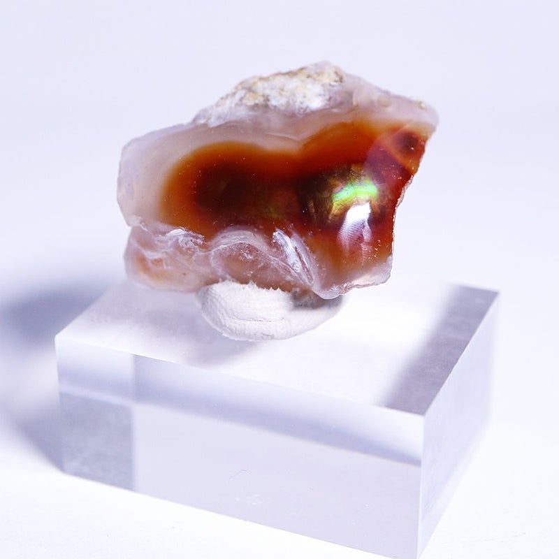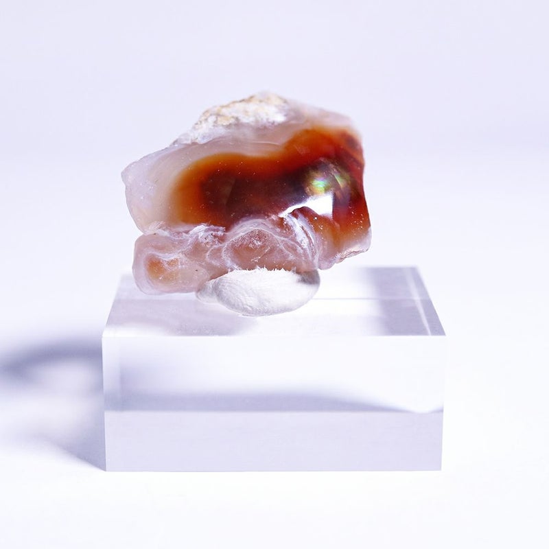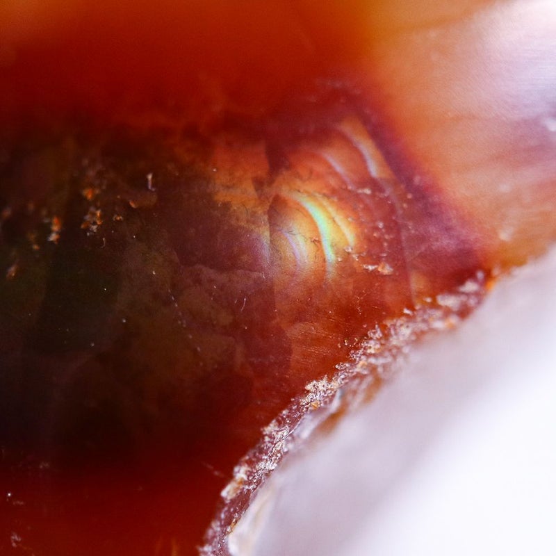 ファイアーアゲートは、アゲートの中にリモナイト(褐鉄鉱)が含まれたもので、光があたることで炎のような揺らめきを見せます。