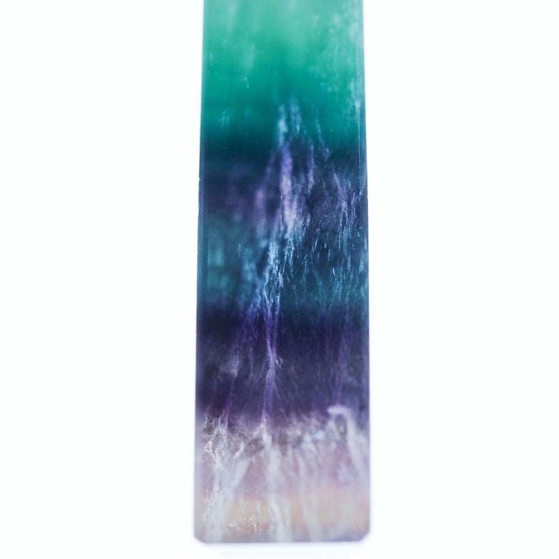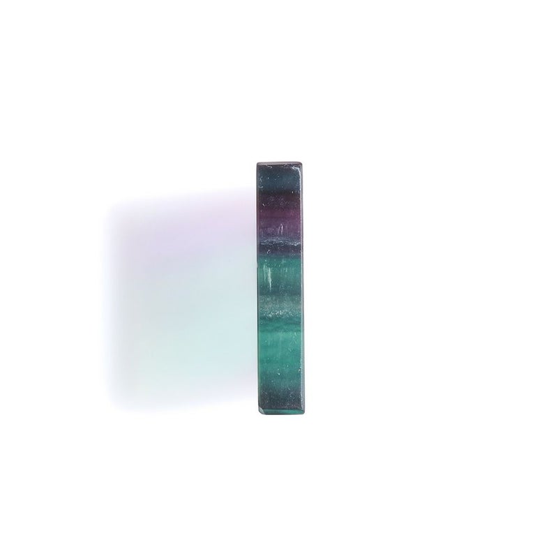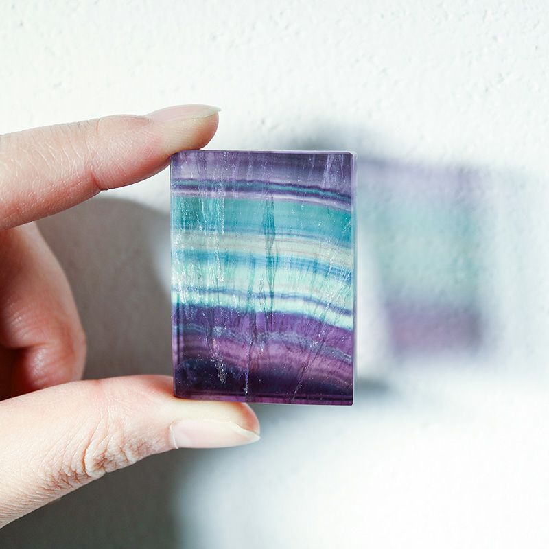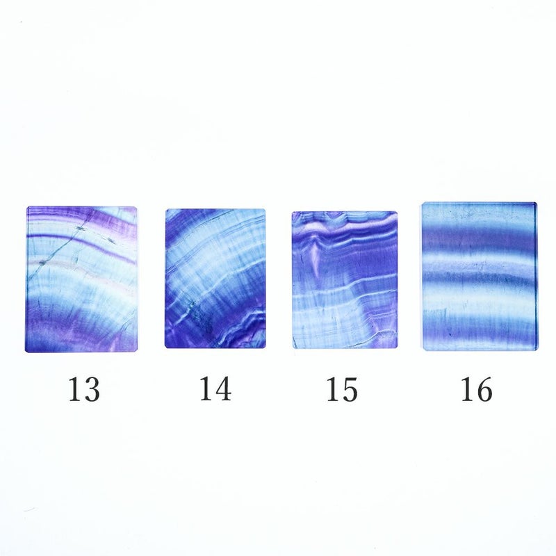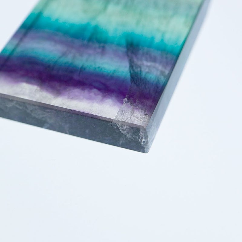 世界で最もカラフルな鉱物と言われる蛍石。 緑や紫など、様々な色合いのものがあり、コレクターも多い人気の鉱物です。 この蛍石プレートは、ひとつの石に複数の色が存在する蛍石をプレート状に切り出したもの。 自然にできた層状のグラデーションが美しく、透明度も高いので、光に透かしてみたり、原石そのものでは見ることのできないような角度から蛍石を観察することができます。 また、蛍石には一定の方向に割れやすい劈開(へきかい)という性質があります。 このプレートの内部に見える細かな雨筋のような模様や、山のように立体的に見える部分が蛍石の劈開です。 まるで夜明けの空ような、幻想的な姿をじっくりとご鑑賞ください。 ■サイズ [1]W33mm × D8mm × H38mm / 30g
