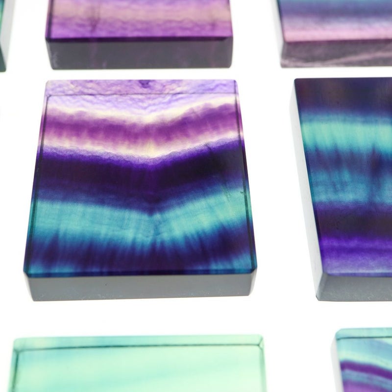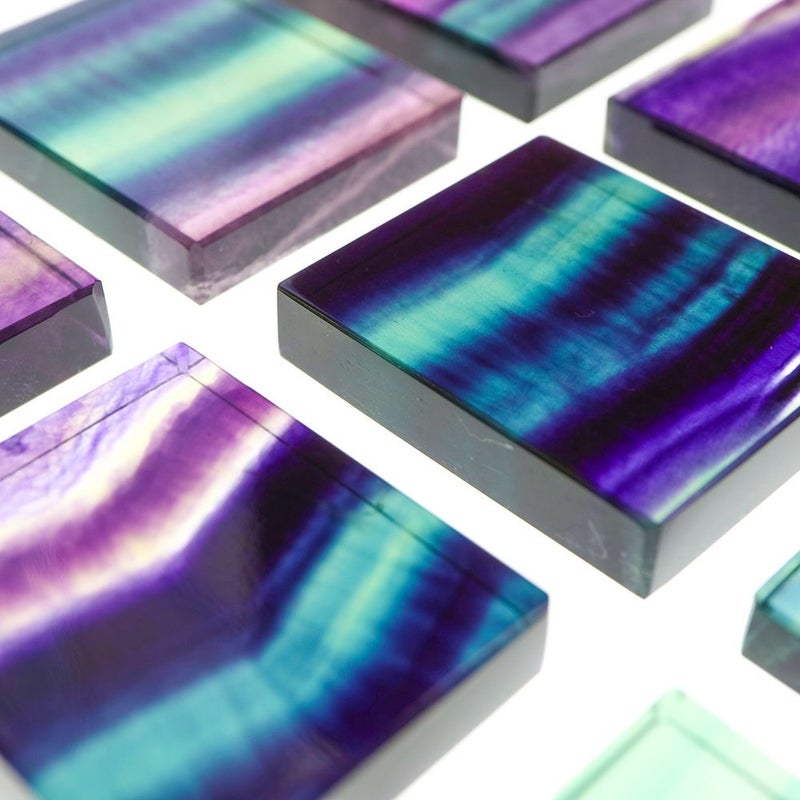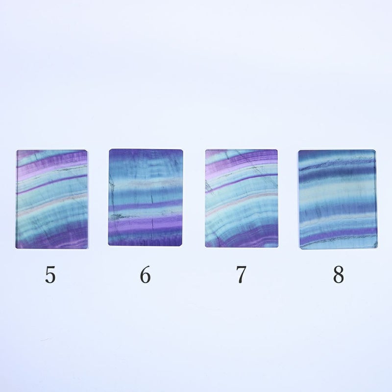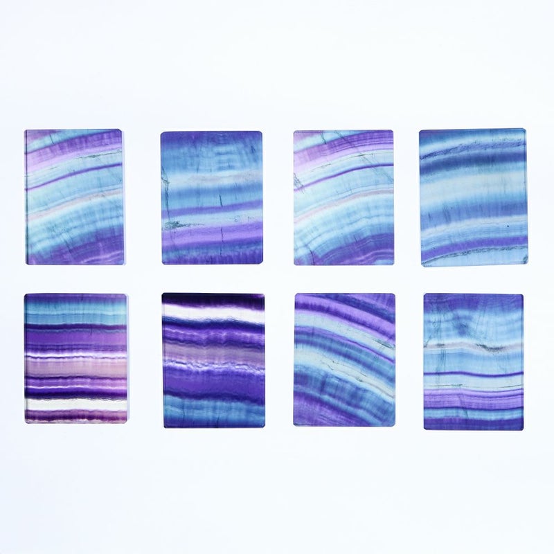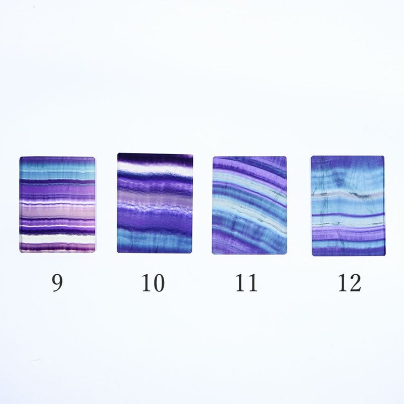 世界で最もカラフルな鉱物と言われる蛍石。 緑や紫など、様々な色合いのものがあり、コレクターも多い人気の鉱物です。 この蛍石プレートは、ひとつの石に複数の色が存在する蛍石をプレート状に切り出したもの。 自然にできた層状のグラデーションが美しく、透明度も高いので、光に透かしてみたり、原石そのものでは見ることのできないような角度から蛍石を観察することができます。 また、蛍石には一定の方向に割れやすい劈開(へきかい)という性質があります。 このプレートの内部に見える細かな雨筋のような模様や、山のように立体的に見える部分が蛍石の劈開です。 まるで夜明けの空ような、幻想的な姿をじっくりとご鑑賞ください。 ■サイズ [1]W33mm × D8mm × H38mm / 30g