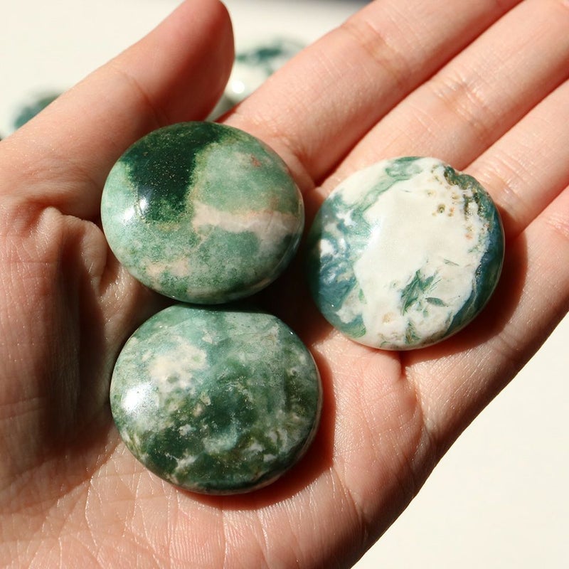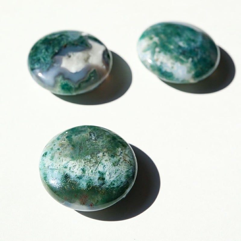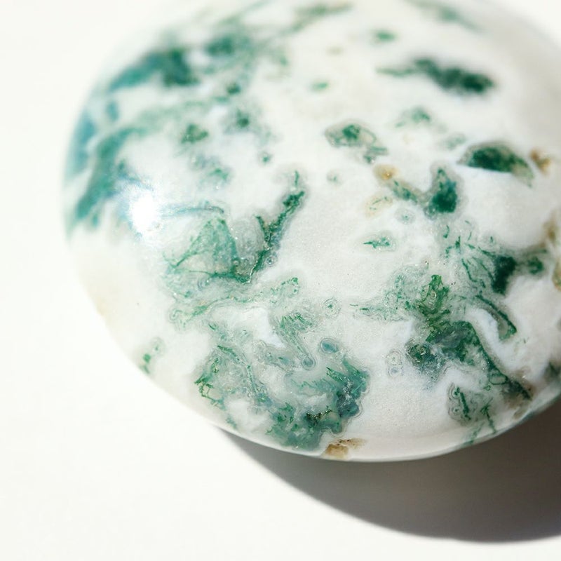 和名で苔瑪瑙(こけめのう)と言われるように、緑や白、茶といった色合いが苔のように見える鉱物です。