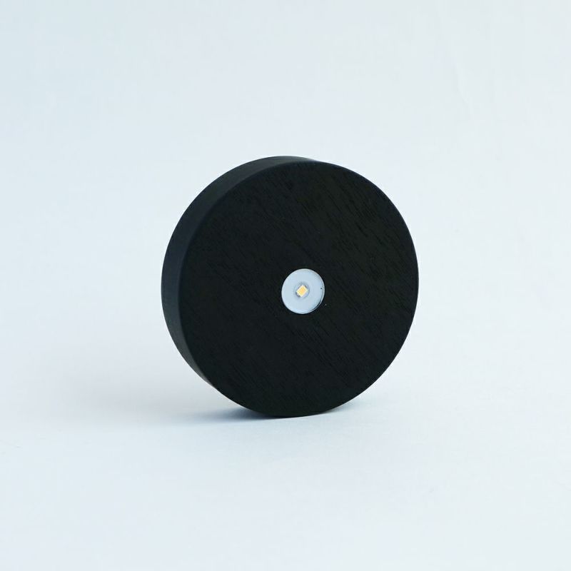 Light Base maru 鉄媒染 照明ブランド「twodo」によるLight Base。 あたたかみのあるWalnutとBirchに加えて、モードな漆黒のLight Baseが数量限定で登場しました! 草木染めの一種である「鉄媒染」で木材を染め上げることで、深い黒色が表現されています。その製法の都合上、一度に製造できる数に限りがあるため、毎回少数の入荷となります。 Light Baseは、上に乗せたものに光を宿す「光源」。 お気に入りの素材を上に乗せてスイッチを押すだけで、手軽に照明として楽しめます。 コードレスですので、演出したい空間の環境に関係なく飾れるのも魅力のひとつ。 LEDを使用しており温度変化がないので、植物や花器などを乗せてご使用いただくことも可能です。 太陽光に近い色温度5000Kのものと、ゆったりした空間にぴったりな、暖かい色味の3000Kのものをご用意いたしました。 ささやかに夜を彩るアクセントとして、テーブルの上や玄関先、廊下、寝室などでお楽しみください。 ■ 素材 天然木、ABS、アクリル ■ サイズ 直径85mm x H20mm ■ 重さ 約110g ■ 仕様 [ ボタン ] 弱→強→ゆらぎ点灯→消灯(8時間で自動消灯) [ 光源 ] LED(色温度:5000K / 3000K) [ 電源 ] 内蔵単3形充電電池 x 2本(市販の単3電池に交換可能) [ 電池寿命 ] 1回の充電につき 弱点灯:約150時間 強点灯:約40時間 ゆらぎ点灯:約70時間 内蔵電池の充電可能回数 2100回 [ 付属品 ] ユーザーガイド (充電用のType-Cケーブルは付属しません) ■ご注意点 ・無垢の天然木を使用しているため、木目や色合いには個体差があります。 ・付属の電池以外の電池を使用した場合は、Light Base本体で充電することはできません。 ・充電用のUSBケーブルは付属しません。市販のType-Cのものをお使いいただけます。