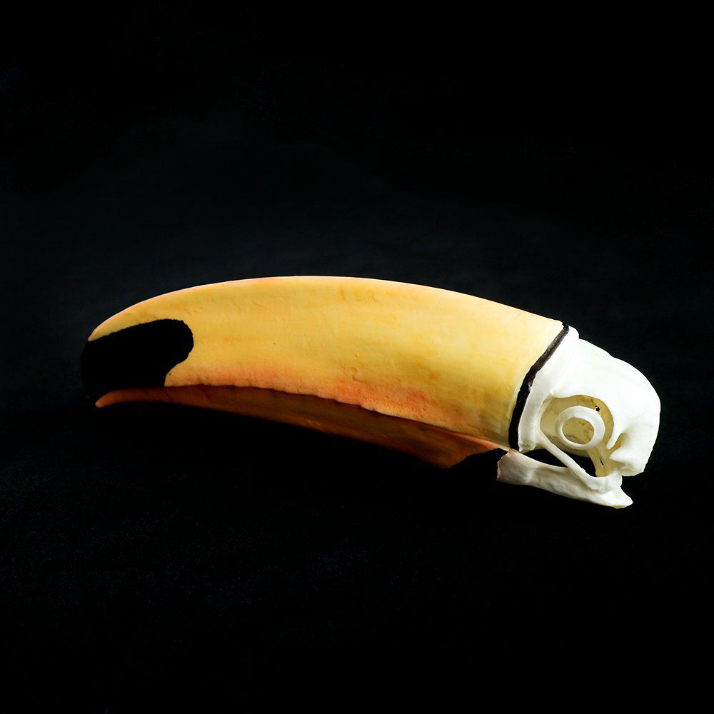 オニオオハシは、とても大きいクチバシが特徴の鳥です。 生息地は南米で、ブラジルの川や森に住んでいます。 クチバシと体の比率が鳥類最大で、クチバシの中は蜂の巣のようなハニカム構造になっており、見た目のわりに軽量です(本レプリカではクチバシの中を確認することはできません)。 また、このクチバシが体温を下げる冷却機のような役割を果たすことが近年わかりました。 様々なイメージキャラクターやペットとして、とても人気がある鳥の一種です。 ■サイズ 頭骨:約D207mm x W43mm x H65mm ■重さ 約83g ■素材 樹脂