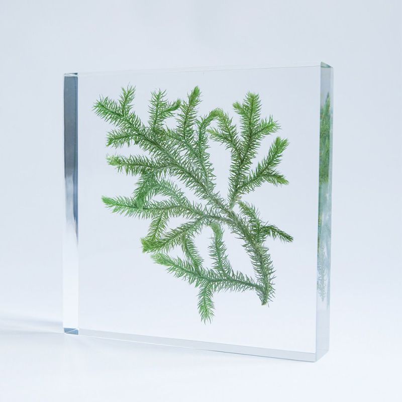 ウサギノネドコの原点でもあるヒカゲノカズラの封入標本です。 ■素材 ポリエステル樹脂、乾燥植物 ■サイズ 約 D25mm × W135mm × H135mm ■ご注意点 。本製品はポリエステル樹脂製のため、特に紫外線の当たらない環境でも経年に伴い黄色く変色する場合がございます。なお、紫外線には強く反応し、早期変色の原因となるため直射日光の当たる場所に置くことはお避けください。 ・本商品は1つ1つ職人が手作りしています。封入されている標本の大きさ、色、形はすべて異なります。写真を確認の上お買い上げください。 ・製造の工程上、内部に微細な気泡やチリ状のものが発生することがありますが、商品の不良ではありません。 ・温度の高い場所に長時間置くと、変形したり細かいクラック(ひび割れ)が入ることがあります。炎天下などの高温を避けてご使用ください。 ・シンナーやアルコールなどの溶液や薬品に触れると細かいクラック(ひび割れ)が入ることがあります。お手入れの際は柔らかい布で拭いてください。