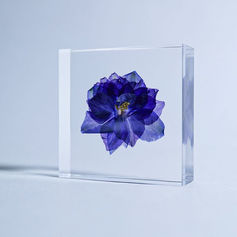 プレートに封入された千鳥草は、八重咲きで青紫色をしたものです。