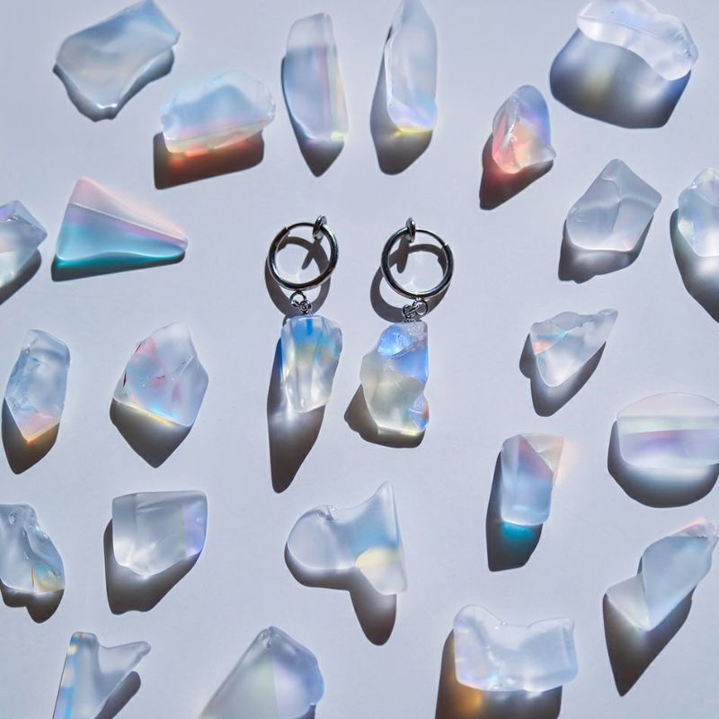 オパールのように色鮮やかな光を内包するガラスのアクセサリー。