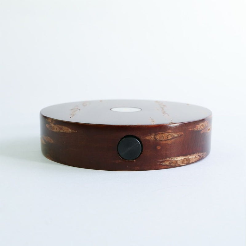 秋田県の進藤電気設計が手がける照明ブランド"twodo"と、同じく秋田県の樺細工ブランド"角舘 伝四郎"のコラボレーションアイテムです。 Light Baseは、上に乗せるものに光を宿す「光源」です。 お気に入りの素材を上に乗せてスイッチを押すだけで、手軽に照明として楽しめます。 このLight Baseはヤマザクラの樹皮を使用した樺細工の工芸品です。 無地皮は丁寧に磨き上げられた艶と、しっくりとくる手触りが魅力的です。 職人の手による美しい樺細工をお楽しみください。 コードレスですので、演出したい空間の環境に関係なく置くことができます。 LEDを使用しており温度変化がないので、植物や花器などを乗せてもお使いいただけます。 素材そのものの色をお楽しみいただけるように、太陽光に近い色温度5000Kのものと、 ゆったりした空間にぴったりな、暖かい色味の3000Kのものをご用意いたしました。 ささやかに夜を彩るアクセントとして、テーブルの上や玄関先、廊下、寝室などでお楽しみください。 ■仕様 ・ボタン 弱→強→ゆらぎ点灯→消灯(8時間で自動消灯) ・サイズ D65mm x W65mm × H20mm ・光源 LED(色温度:5000K、3000K) ・電源 内蔵単3形充電電池 x 2本(市販の単3電池に交換可能) ・電池寿命 1回の充電につき 弱点灯:約150時間 強点灯:約40時間 ゆらぎ点灯:約70時間 内蔵電池の充電可能回数 2100回 ・重さ 約110g (内蔵充電電池含む) ・付属品 ユーザーガイド (充電用のmicroUSBケーブルは付属しません) ■ご注意点 ・無垢の天然木を使用しているため、木目や色合いには個体差があります。 ・付属の電池以外の電池を使用した場合は、Light Base本体で充電することはできません。 ・充電用のUSBケーブルは付属しません。市販のmicroUSBタイプのものをお使いいただけます。