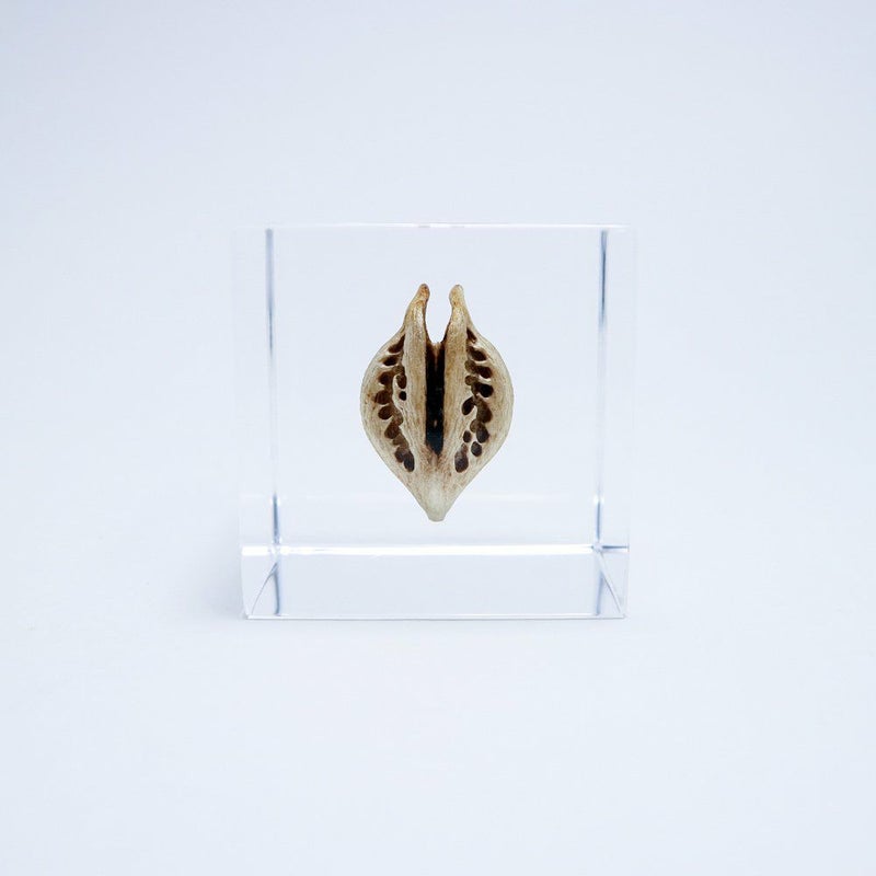 宙言葉:爪を研いで待つ 2本のツメは動物にくっついて種子を遠くへ運ぶための物。 このツメが徐々に開き、その間から種子をばら撒きます。 英語圏では「悪魔の爪」とも呼ばれています。 ■素材 アクリル樹脂、乾燥植物 ■サイズ D40mm × W40mm × H40mm ■重さ 74グラム ■ご注意点 ・Sola cube は1つ1つ職人が手作りしています。封入されている植物の大きさ、色、形はすべて異なります。 ・製造の工程上、内部に微細な気泡やチリ状のものが発生することがありますが、商品の不良ではありません。 ・温度の高い場所に長時間置くと、変形したり細かいクラック(ひび割れ)が入ることがあります。炎天下などの高温を避けてご使用ください。 ・シンナーやアルコールなどの溶液や薬品に触れると細かいクラック(ひび割れ)が入ることがあります。お手入れの際は柔らかい布で拭いてください。