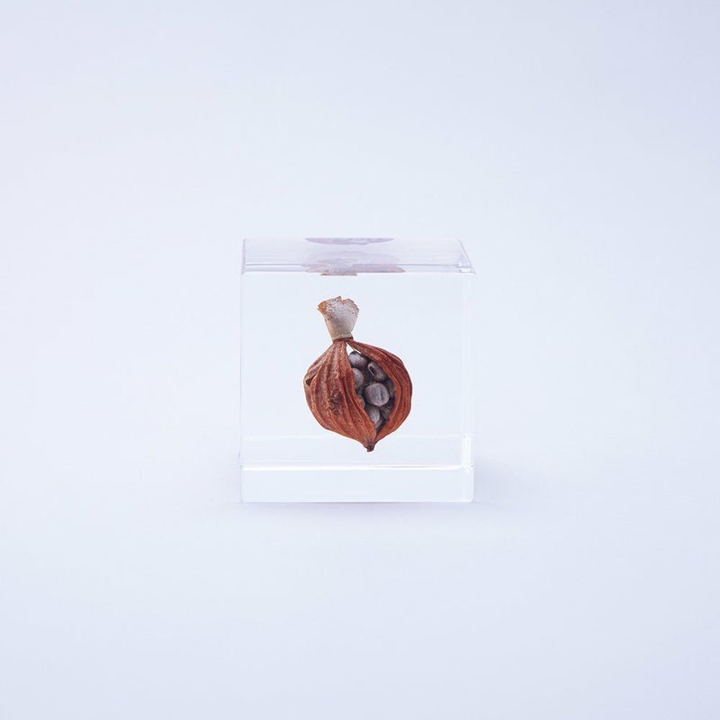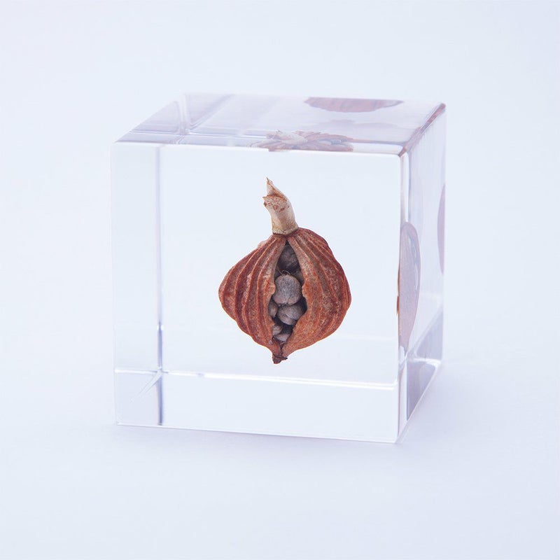 宙言葉:さりげない気遣い 沖縄などに分布するショウガの仲間。花のつぼみが桃のようなので「月桃」と呼ばれています。 乾燥して開いた実からのぞく部分が種子で、整腸作用のある薬や茶として利用されます。 ■素材 アクリル樹脂、乾燥植物 ■サイズ D40mm × W40mm × H40mm ■重さ 74グラム ■ご注意点 ・Sola cube は1つ1つ職人が手作りしています。封入されている植物の大きさ、色、形はすべて異なります。 ・製造の工程上、内部に微細な気泡やチリ状のものが発生することがありますが、商品の不良ではありません。 ・温度の高い場所に長時間置くと、変形したり細かいクラック(ひび割れ)が入ることがあります。炎天下などの高温を避けてご使用ください。 ・シンナーやアルコールなどの溶液や薬品に触れると細かいクラック(ひび割れ)が入ることがあります。お手入れの際は柔らかい布で拭いてください。