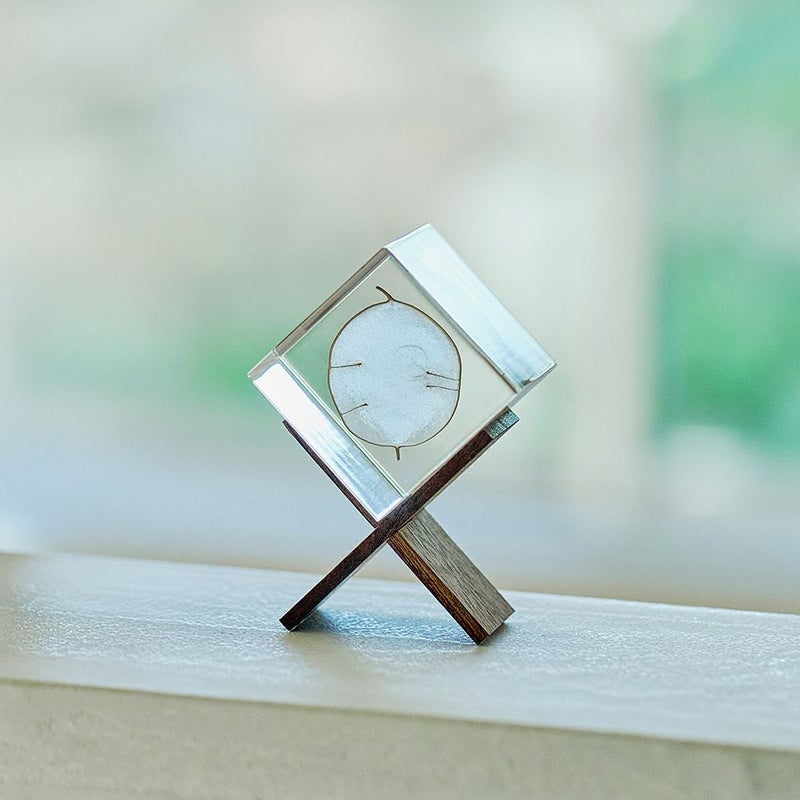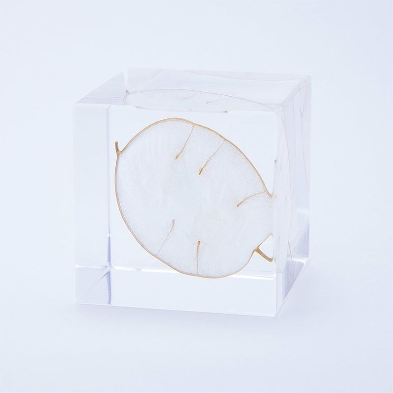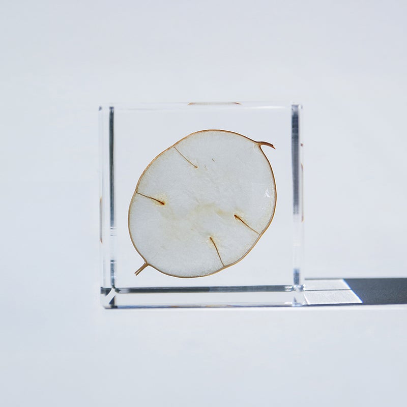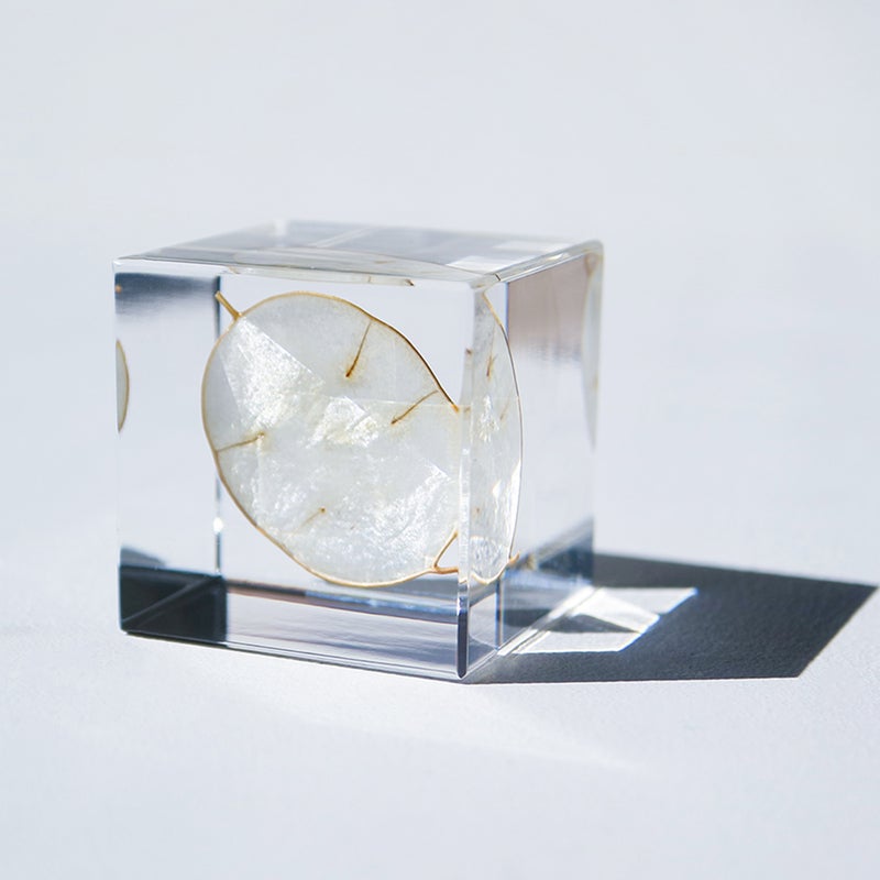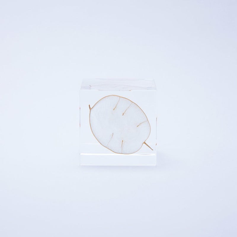宙言葉:月に願いを 果実が月のように見えるため、ラテン語で月を意味する「Luna」が名前の由来です。果実が熟すと外皮と種子が落ち、白い膜状の内皮が残ります。 枯れてなお満月のような美しさが際立ちます。 ■素材 アクリル樹脂、乾燥植物 ■サイズ D40mm × W40mm × H40mm ■重さ 74グラム ■ご注意点 ・Sola cube は1つ1つ職人が手作りしています。封入されている植物の大きさ、色、形はすべて異なります。 ・製造の工程上、内部に微細な気泡やチリ状のものが発生することがありますが、商品の不良ではありません。 ・温度の高い場所に長時間置くと、変形したり細かいクラック(ひび割れ)が入ることがあります。炎天下などの高温を避けてご使用ください。 ・シンナーやアルコールなどの溶液や薬品に触れると細かいクラック(ひび割れ)が入ることがあります。お手入れの際は柔らかい布で拭いてください。