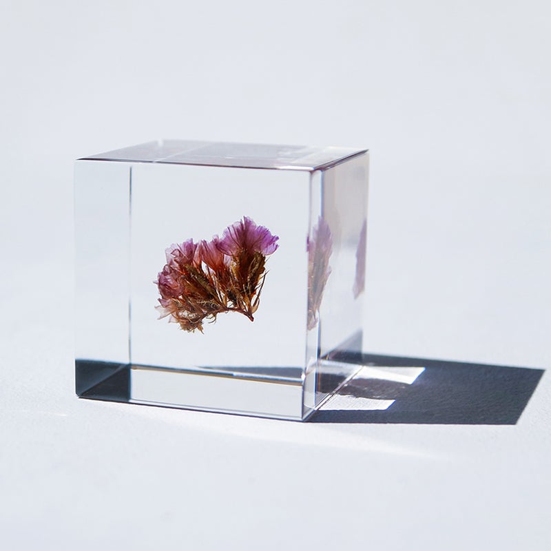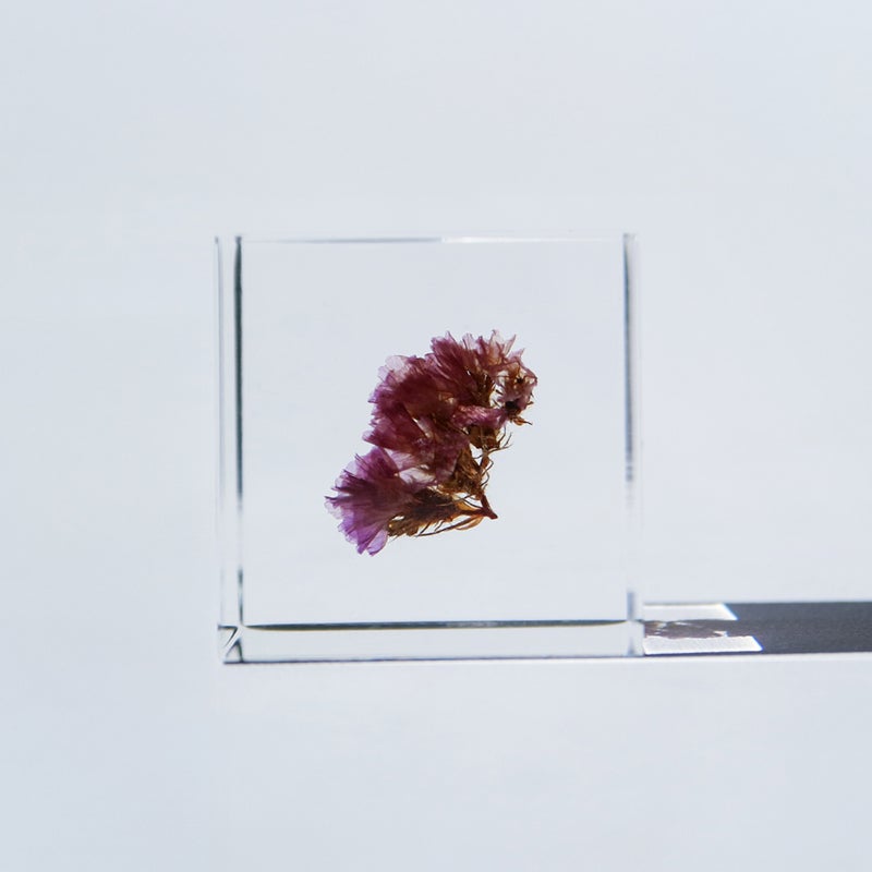 宙言葉:雨は止む 花のように見える部分は萼(がく)が発達したもので、この中から小さな白い花が咲きます。 「statice」は「止める」という意味のギリシャ語の「statizo」が語源で、かつて胃腸薬の一種として使われていたそうです。 ■素材 アクリル樹脂、乾燥植物 ■サイズ D40mm × W40mm × H40mm ■重さ 74グラム ■ご注意点 ・Sola cube は1つ1つ職人が手作りしています。封入されている植物の大きさ、色、形はすべて異なります。 ・製造の工程上、内部に微細な気泡やチリ状のものが発生することがありますが、商品の不良ではありません。 ・温度の高い場所に長時間置くと、変形したり細かいクラック(ひび割れ)が入ることがあります。炎天下などの高温を避けてご使用ください。 ・シンナーやアルコールなどの溶液や薬品に触れると細かいクラック(ひび割れ)が入ることがあります。お手入れの際は柔らかい布で拭いてください。