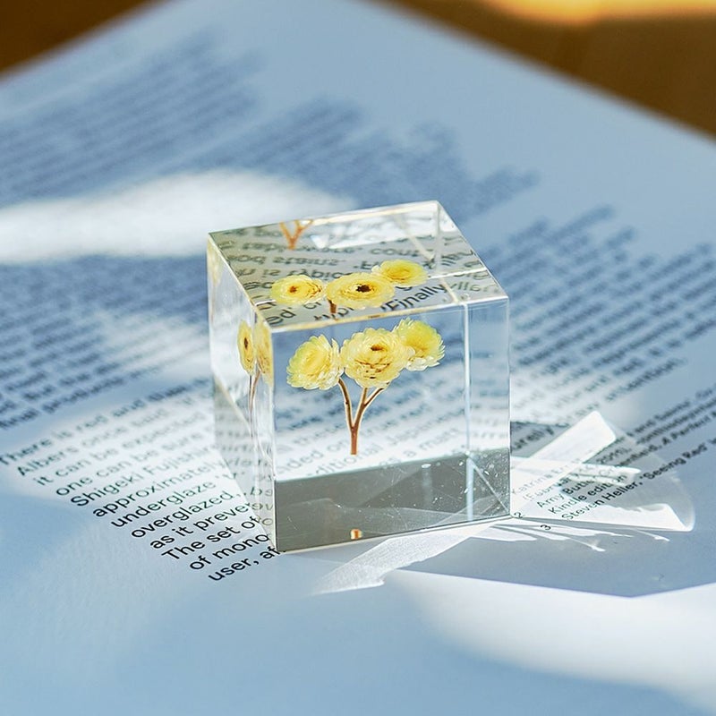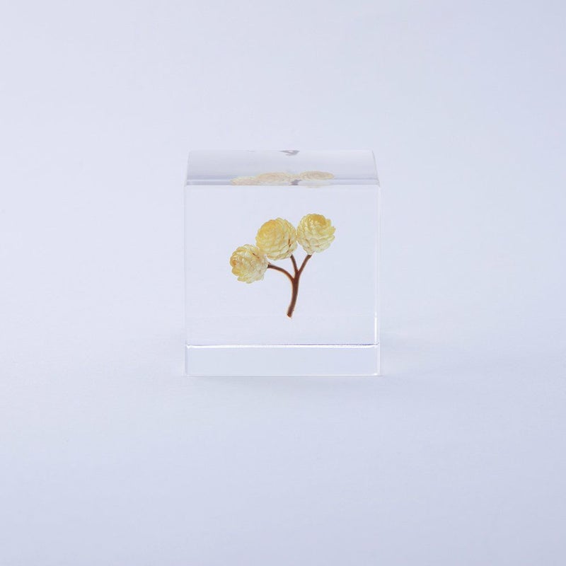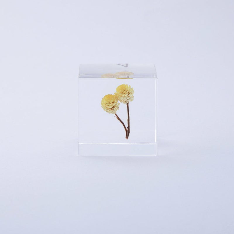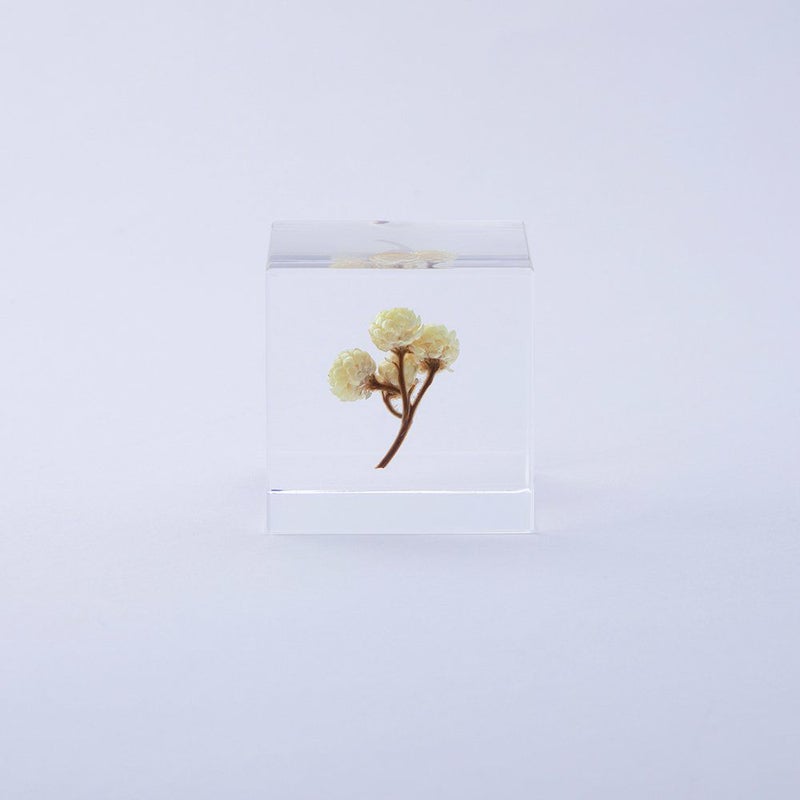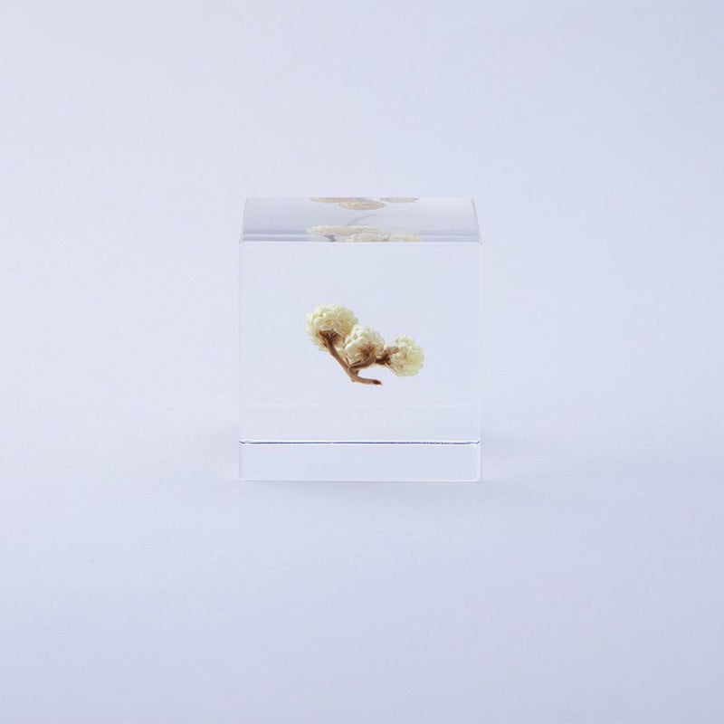 ■素材 アクリル樹脂、乾燥植物 ■サイズ D40mm × W40mm × H40mm ■重さ 74グラム ■ご注意点 ・Sola cube は1つ1つ職人が手作りしています。封入されている植物の大きさ、色、形はすべて異なります。 ・製造の工程上、内部に微細な気泡やチリ状のものが発生することがありますが、商品の不良ではありません。 ・温度の高い場所に長時間置くと、変形したり細かいクラック(ひび割れ)が入ることがあります。炎天下などの高温を避けてご使用ください。 ・シンナーやアルコールなどの溶液や薬品に触れると細かいクラック(ひび割れ)が入ることがあります。お手入れの際は柔らかい布で拭いてください。