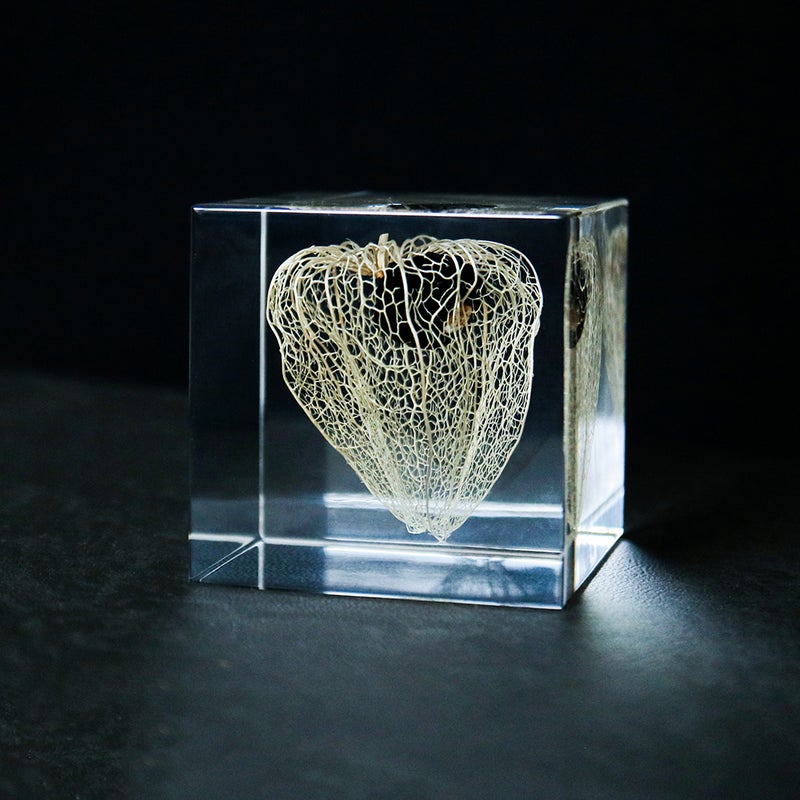 に乗せますと、繊細な造形が際立って見えます。 ■素材 アクリル樹脂、乾燥植物 ■サイズ D50mm × W50mm × H50mm ■重さ 148グラム ■ご注意点 ・Sola cube は1つ1つ職人が手作りしています。封入されている植物の大きさ、色、形はすべて異なります。 ・製造の工程上、内部に微細な気泡やチリ状のものが発生することがありますが、商品の不良ではありません。 ・温度の高い場所に長時間置くと、変形したり細かいクラック(ひび割れ)が入ることがあります。炎天下などの高温を避けてご使用ください。 ・シンナーやアルコールなどの溶液や薬品に触れると細かいクラック(ひび割れ)が入ることがあります。お手入れの際は柔らかい布で拭いてください。
